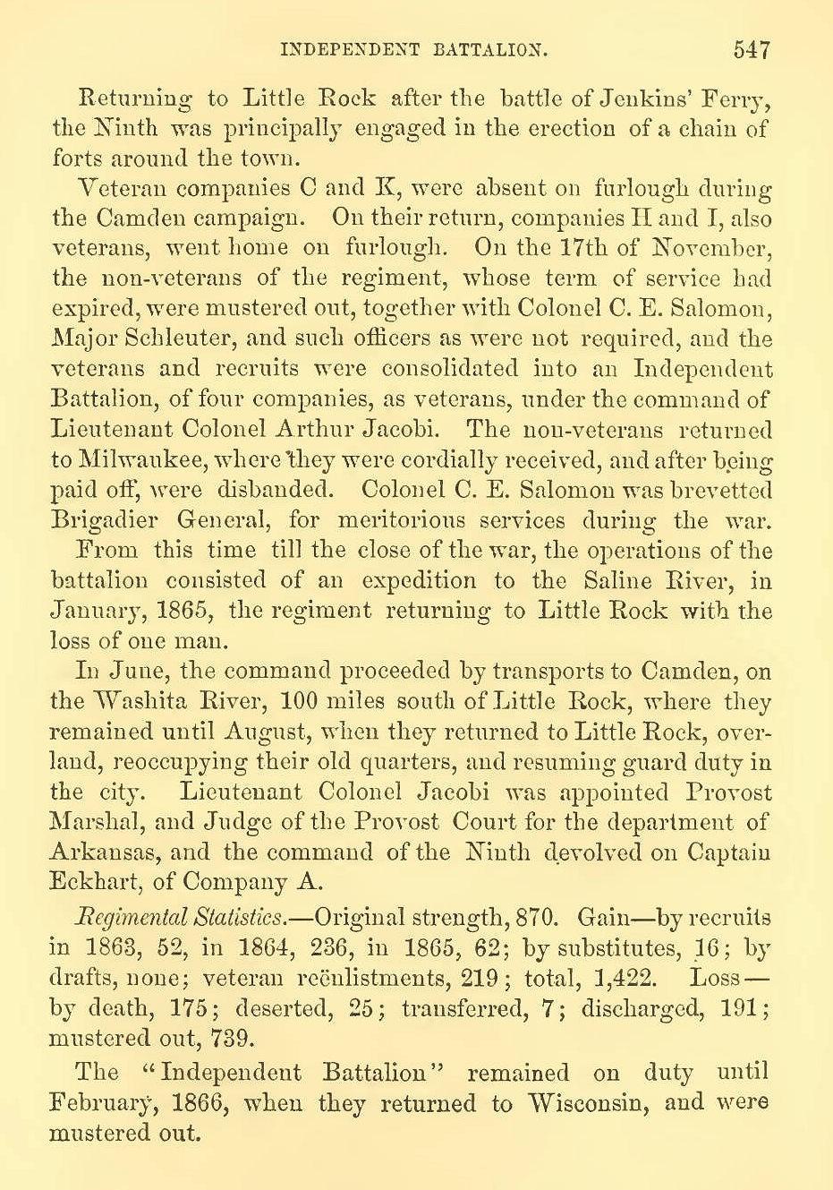 It participated in the Battle of Prairie Grove, Arkansas. The regiment mustered out of active service on January 30, 1866. It lost 191 men during service. Seventy-seven enlisted men were killed and 114 enlisted men died from disease. Source: Wisconsin Historical Society