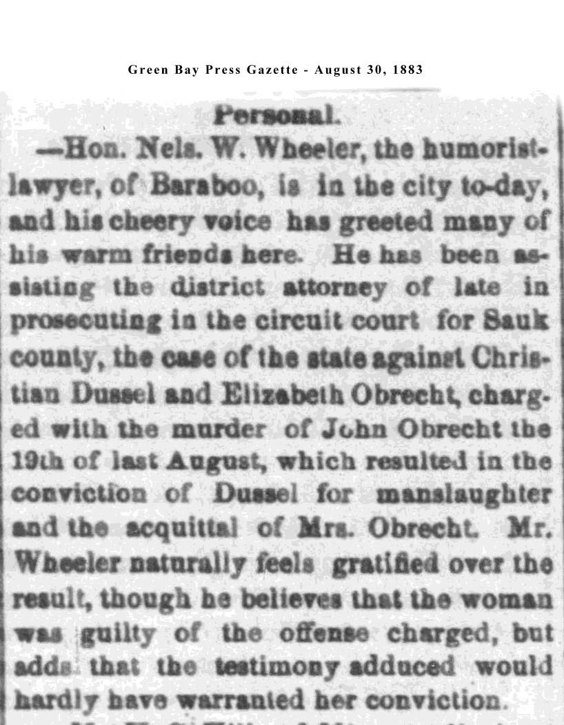 Hon. Nels. W. Wheler, the humorist-lawyer, of Baraboo, is in the city to-day, and his cheery voice has greeted many of his warm friends here. He has been assisting the district attorney of late in prosecuting in the circuit court for Sauk county, the case of the state against Christian Dussel and Elizabeth Obrecht, charged with the murder of John Obrecht the 19th of last August, which resulted in the conviction of Dussel for manslaughter and the acquittal of Mrs. Obrecht. Mr. Wheeler naturally feels gratified over the result, thought he believes that the woman was guilty of the offense charged, but adds that the testimony advanced would hardly have warranted her conviction.