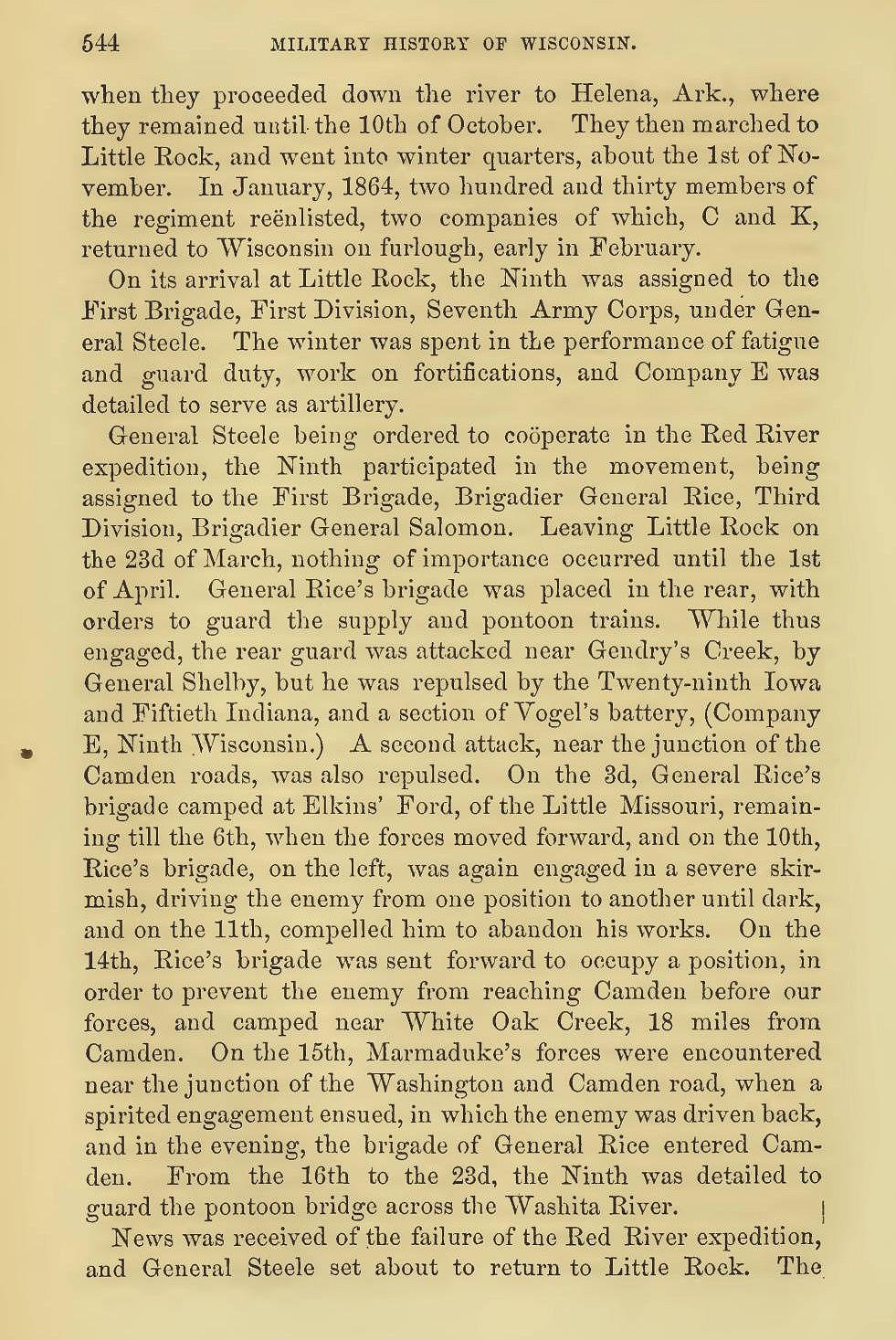 The 9th Wisconsin Infantry was organized at Camp Sigel, in Milwaukee, mustered into service on October 26, 1861, and left for Fort Leavenworth, Kansas, on January 22, 1862. From there it marched to Fort Scott, Kansas, conducted expeditions on the southern plains, and then moved through Missouri and Arkansas.