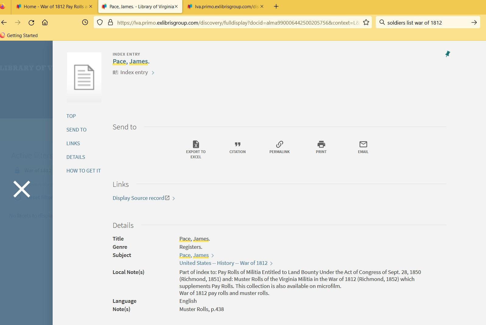 Extract from a list of soldiers who served in the War of 1812 for James Pace