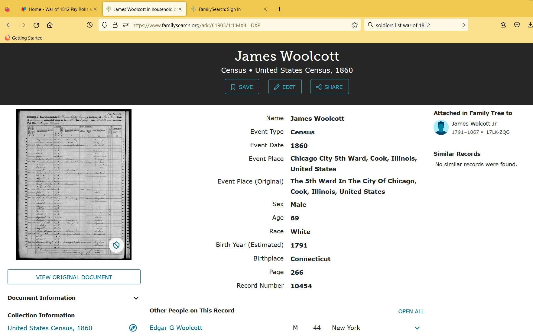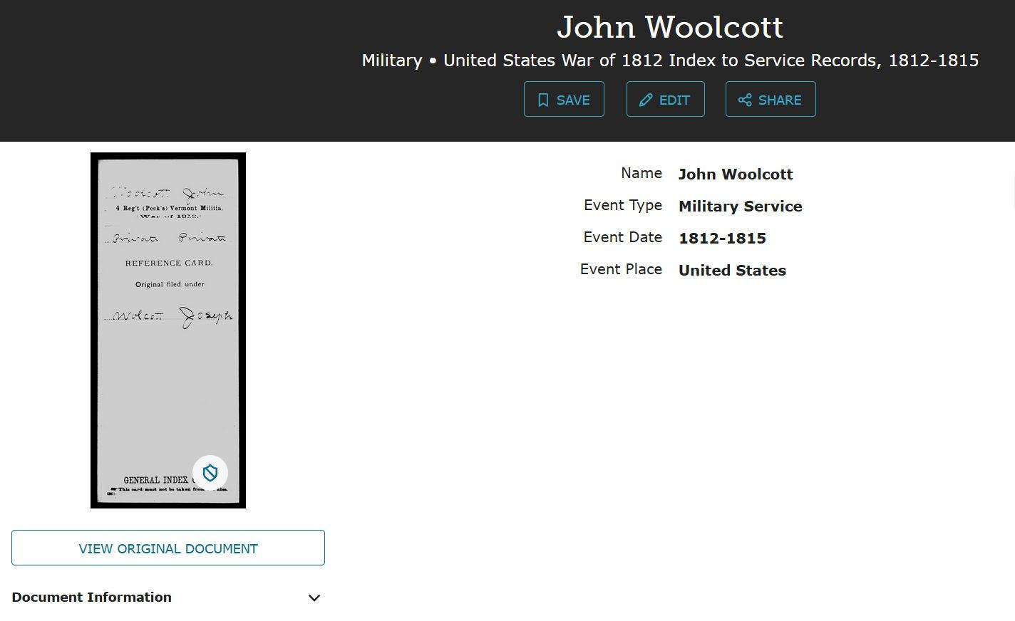 The Reference Card indicates that John Woolcott served in the 4th (Pecks or Capt. Lewis Peckham's Co.) Vermont Militia during the War of 1812. His obituary notes that he was living in Vermont at the time of his enlistment in 1808.