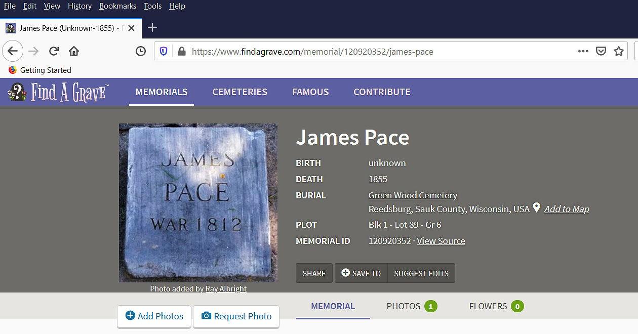 It is unknown with any certainty, if this is the James Pace who is listed as being buried in Reedsburg’s Greenwood Cemetery. Both these names are connected with the War of 1812. It’s possible that the writer of the above 1904 article got the first name wrong. Or, when the tombstone marker was created, they got the wrong first name. The burial date for William Pace is noted as being about 1860. James Pace is listed as being buried in 1855. It’s possible that these two dates were just estimates, or someone’s best guess.