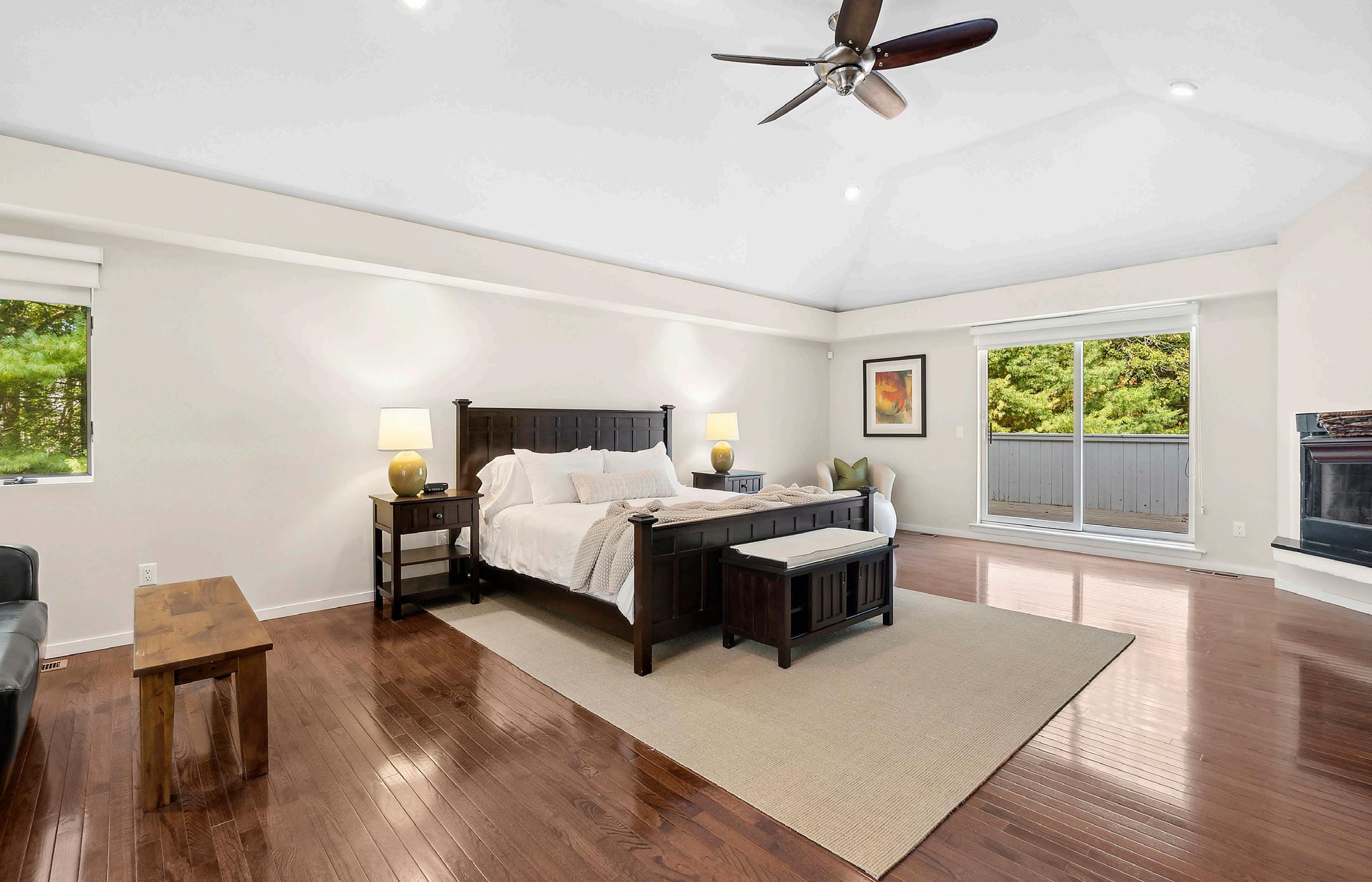 • 2nd floor XL primary suite – vaulted ceiling (10’ 10’’), fireplace, walk-in closet, sliding glass door to private rear balcony deck overlooking pool and tennis