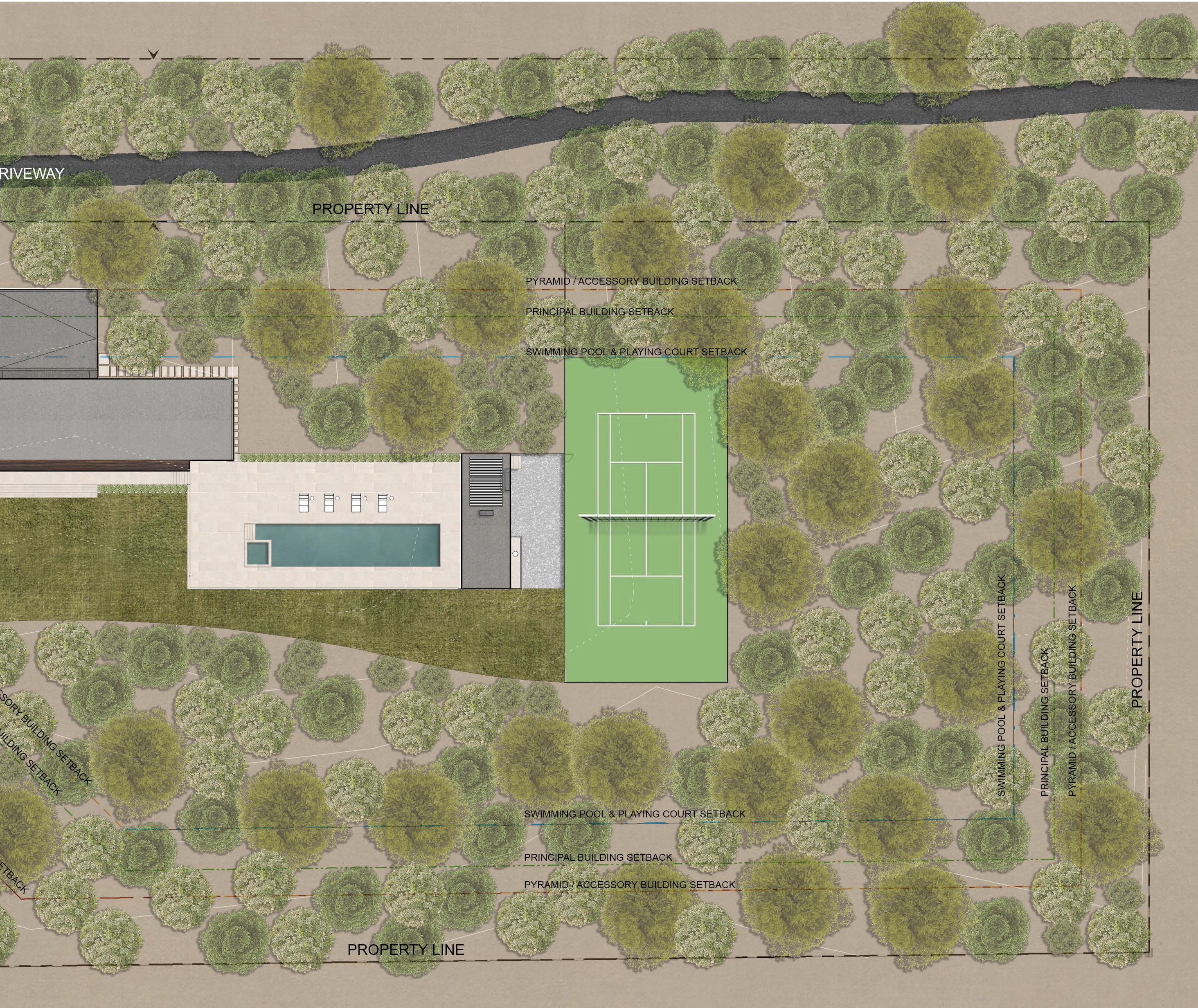 made for enjoyment, with a theater, gym, sauna, spa and steam room. An entertainment area provides seating and kitchenette with dishwasher, sink, microwave and pantry. Two lower level bedrooms are each ensuite and there’s a second laundry as well. Toward the rear of the property, find the trifecta of outdoor amenities with pool, pool house and tennis. An oversized heated gunite pool and spa is surrounded by spacious patios large enough to cover all your outdoor entertaining needs. A sleek pool house with large overhang sits at the foot of the pool and offers a covered area for respite from the sun, as well as the perfect vantage point to view the tennis court which lies beyond it. Take advantage of the impeccable plans in place or start fresh and design your dream home on this most worthy canvas.