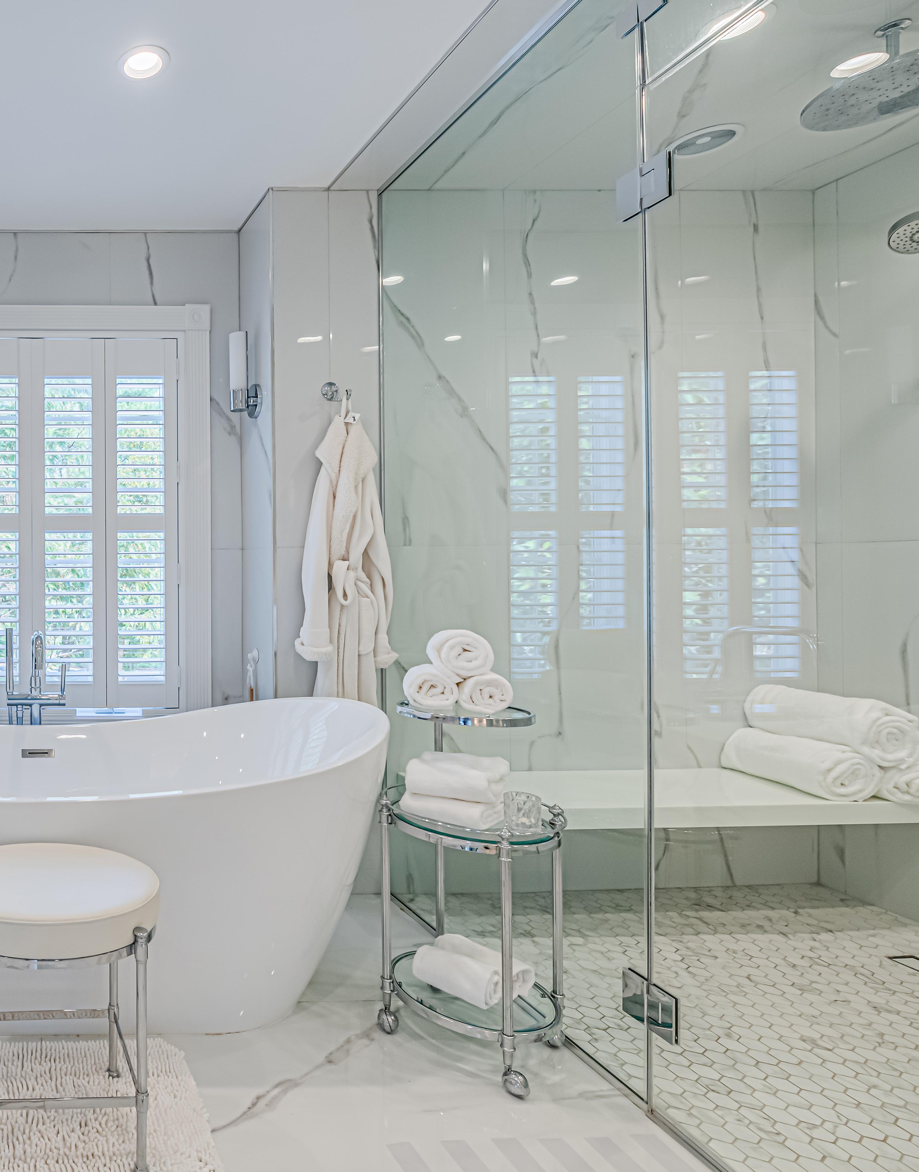 • Master Bathroom features Double Steam Shower with Custom Frameless Glass Door, Soaking Tub, Kohler Fixtures, Heated Amba Towel Racks, Anti-Fog Halo Mirror