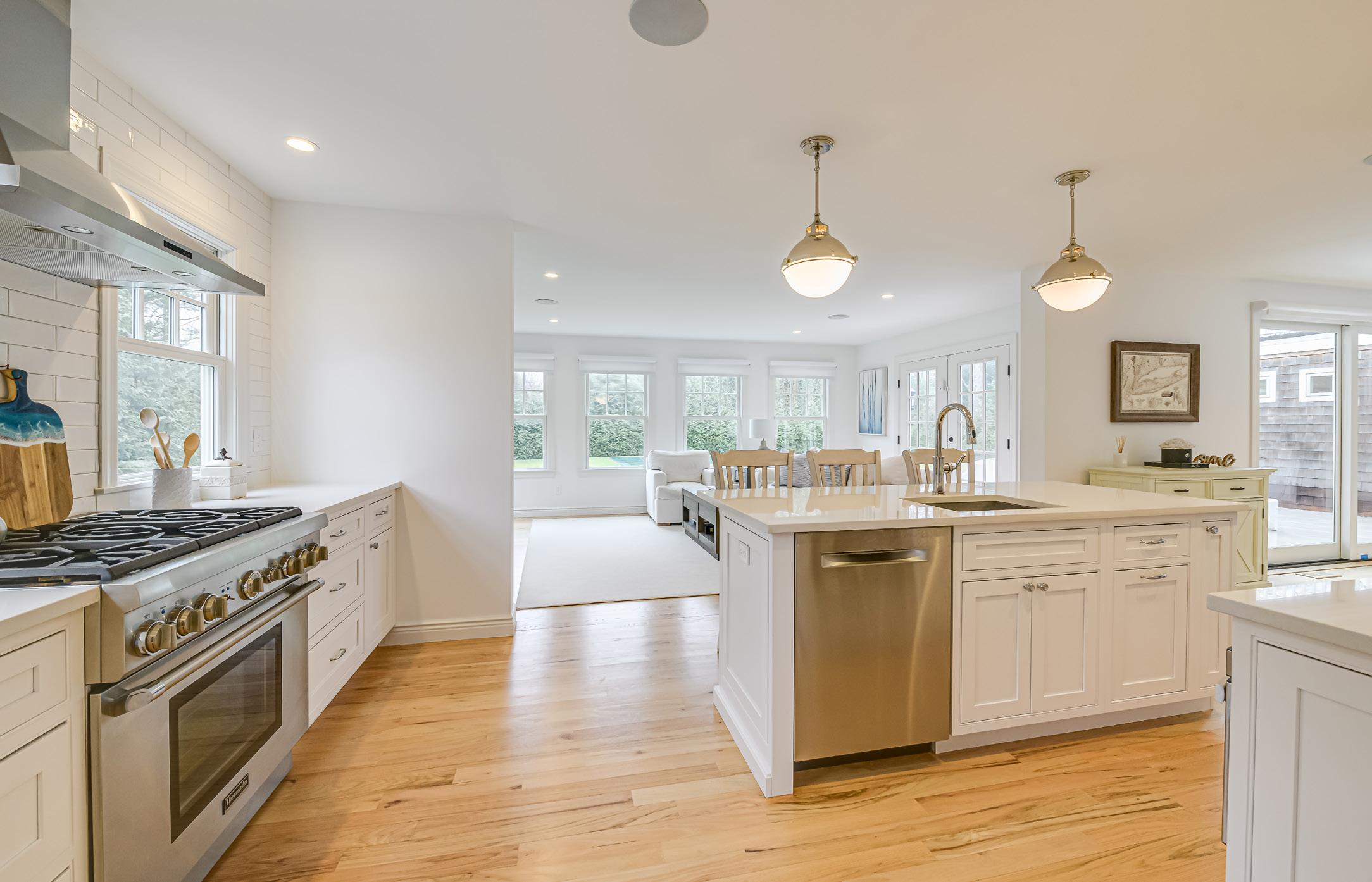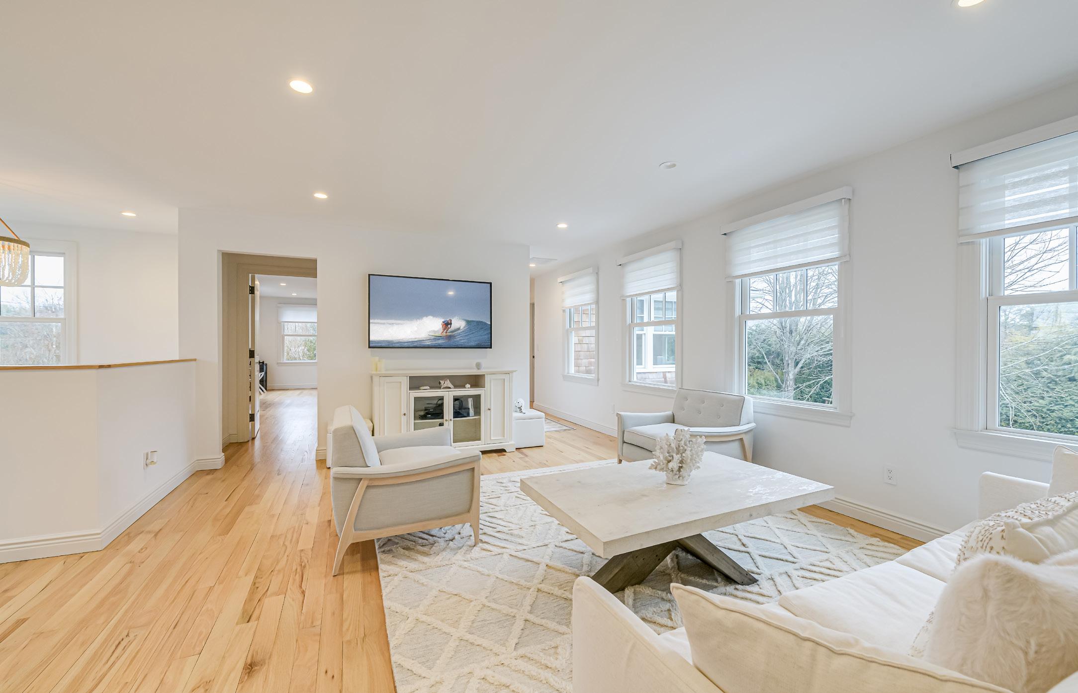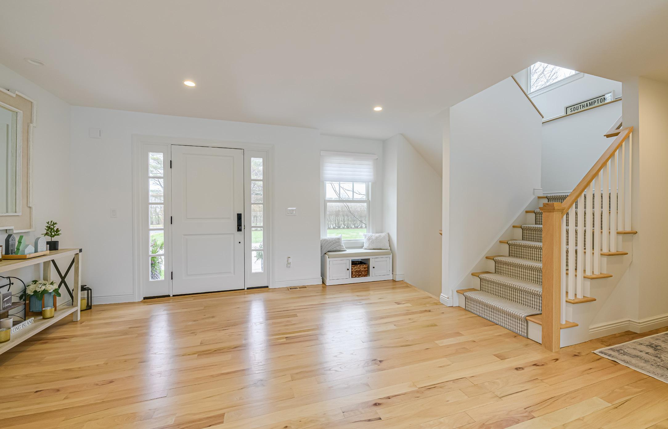 Entirely renovated in 2019, this traditional home is conveniently located South of the Highway, moments from beautiful Coopers Beach and five world-class golf courses, including the prestigious Shinnecock Hills Golf Club, the Southampton Golf Club, and National Golf Links of America. Privacy and peace surround this beautifully renovated property in a neighborhood of quiet streets. Situated on .56 acre, the 3,800⁺/- sq. ft. home features 80+ perimeter trees that protect a sprawling western-facing backyard. Inside, a generous open floor plan on the first level flows from the entry to the dining area with a dry bar, a living room with a fireplace, and an ensuite bedroom. The kitchen is equipped with premium stainless steel appliances by Thermador and Bosch and opens to a family room overlooking the backyard with egress to a generous patio for dining al fresco. The first floor is completed by a powder room, side entrance/mud room, and generous food pantry. Upstairs are 3 ensuite bedrooms all with custom California closets, including the primary bedroom with a walk-in closet, a luxe bath with a dual vanity sink, and a large glass-walled shower. Plus, a breathtaking outside deck to enjoy dazzling sunsets. Also on this level, an open area perfect for family time or movie watching and a laundry room with a linen closet. The finished lower level has another half bath and is ready to accommodate a spacious media or rec room. Loaded with premium technology that takes this luxury home to another level, including a built-in Sonos system throughout the home and patio, automatic blinds and sprinklers, a Lutron lighting system, security cameras, and outside WiFi boosting. No detail has been spared in this home complete with stair runners, ample storage, a Fido fence, French drain on the front, and a circular driveway with a stone parking area. Easy outdoor living is maximized with a heated 20’x40’ gunite pool with a new heater and a spacious 20’x14’ bluestone patio for relaxing by the pool. The flat, open backyard includes a half basketball court and allows for plenty of room for recreation and entertainment.