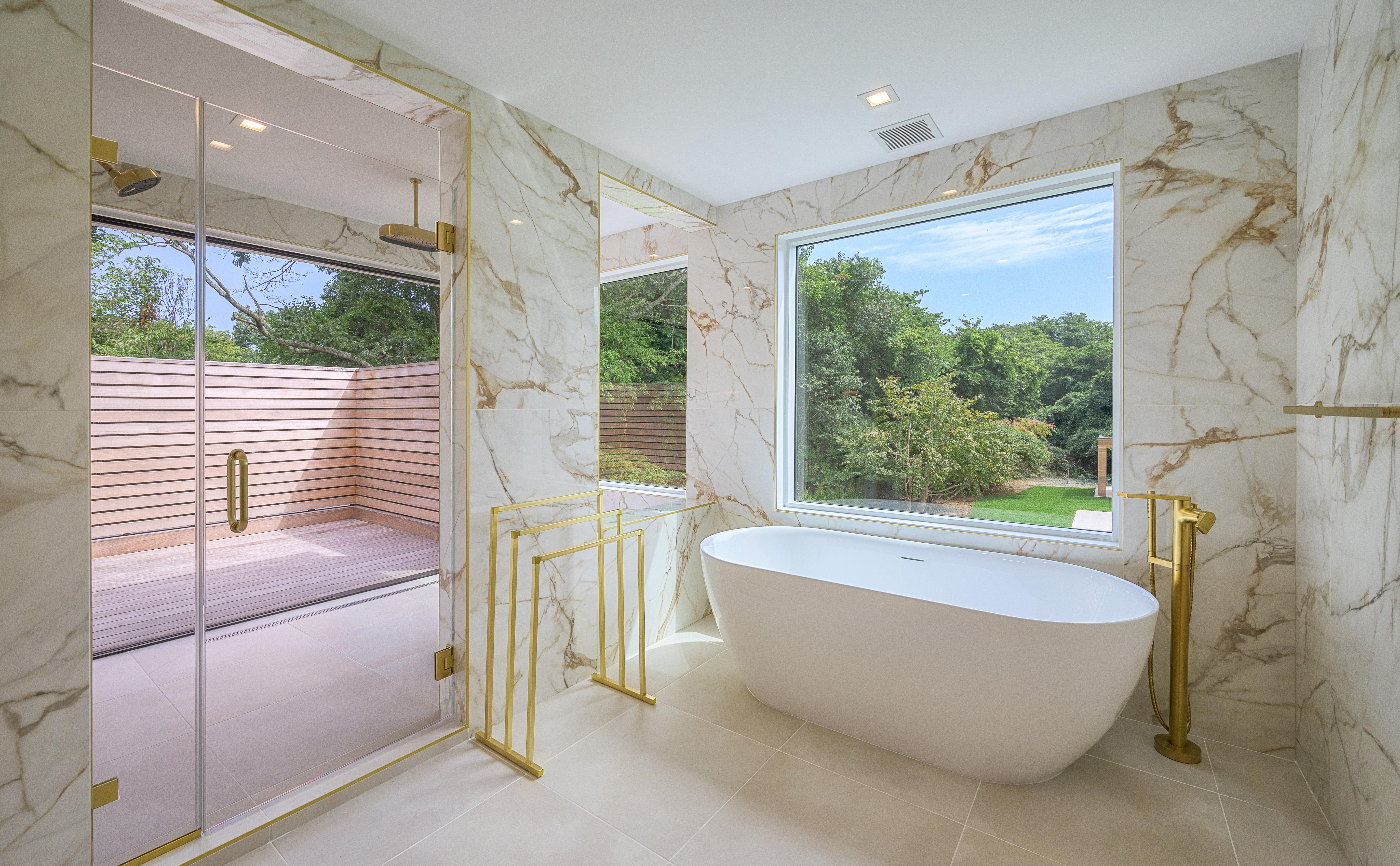 Two generous primary suites on the first and second levels deliver the definitive Hamptons experience with ingenious luxury amenities you’ll fall in love with every day. Both have private patios, fireplaces, chic indoor/outdoor baths, and boutique-like walk-in closets. On the first floor, find an ultra-premium outdoor gunite spa; upstairs, a private balcony, and a luxe bath with a sliding wall that converts to an outdoor shower.