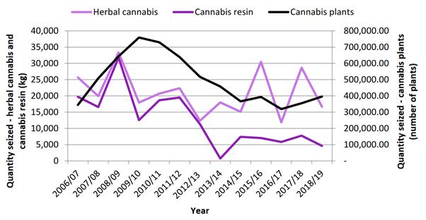 In 2018/19, seizures of Class B drugs in England and Wales increased by 11% on the previous year, with cannabis accounting for 94% of Class B drugs seized, totalling 108,362 seizures. The increase has been driven by an increase in seizures of herbal cannabis and cannabis plants. In that year, a total of 395,843 cannabis plants were seized, an increase of 12% since 2017/18 when 354,540 plants were seized.1