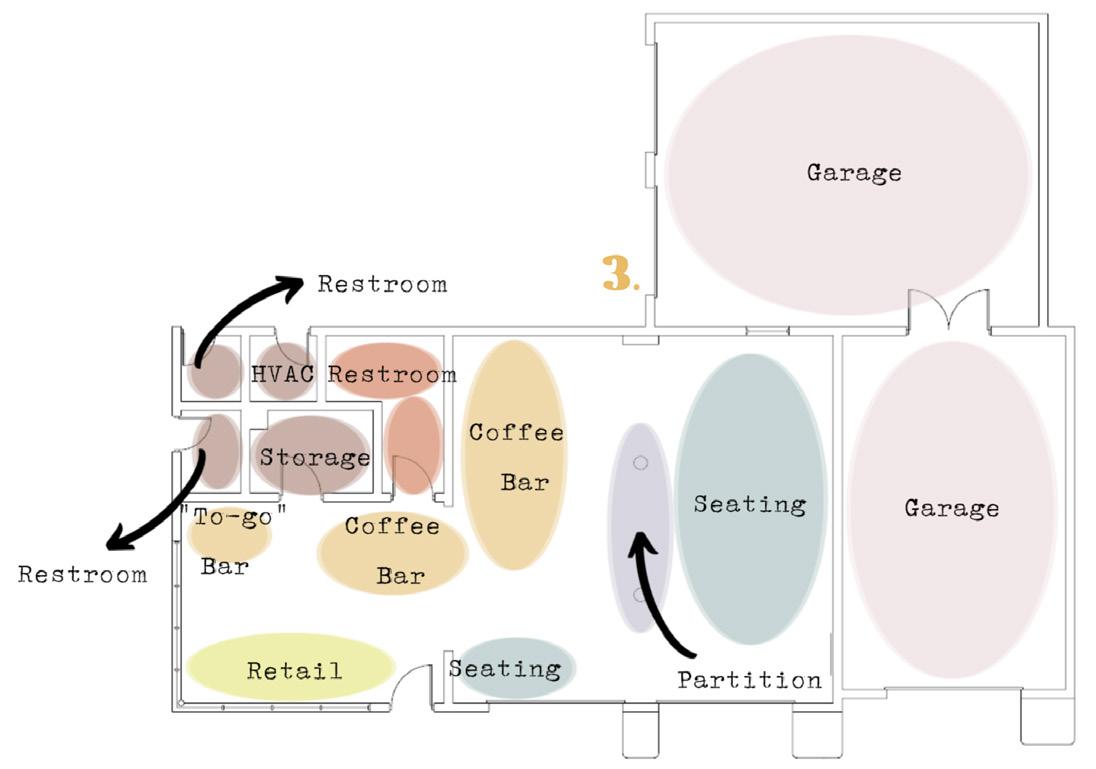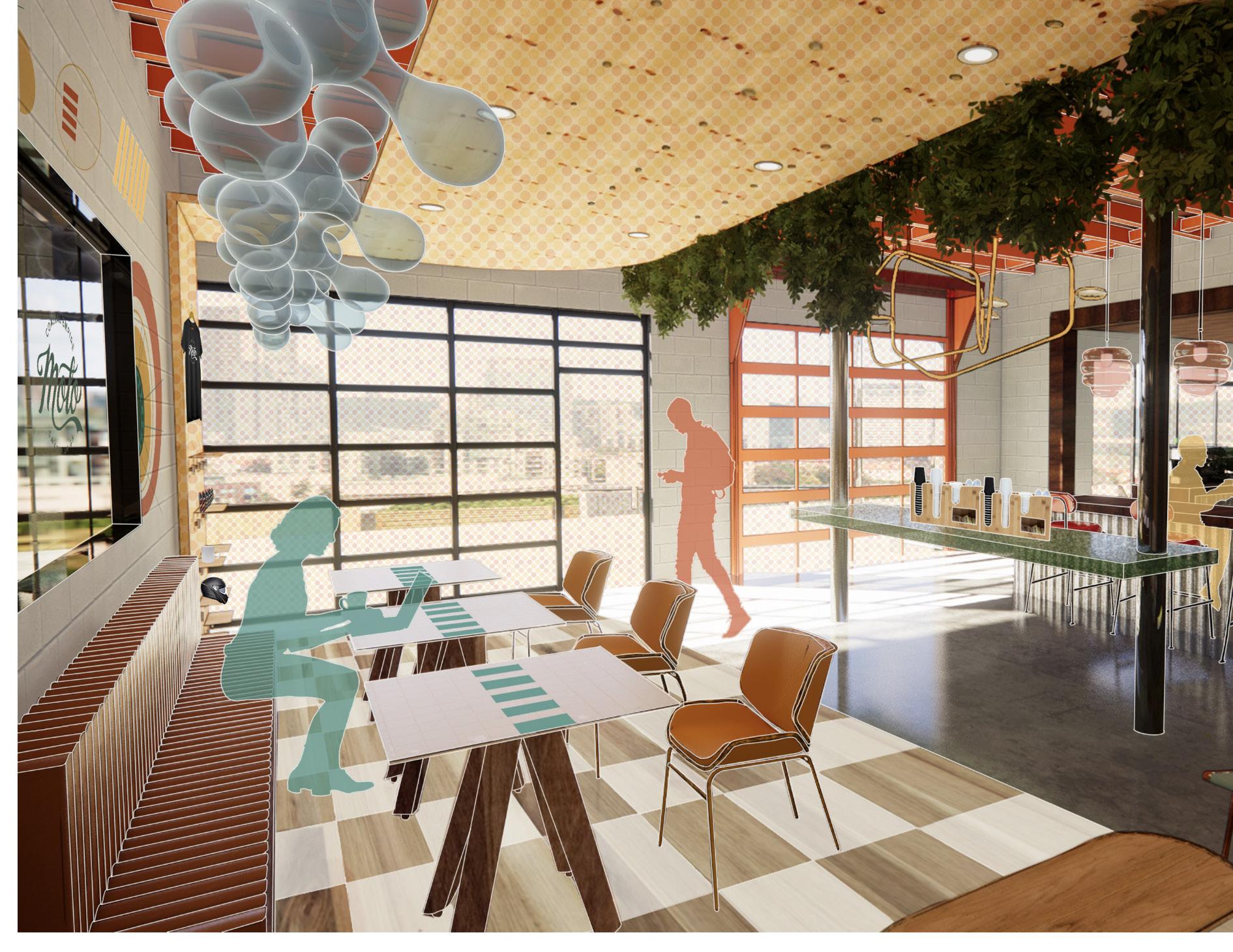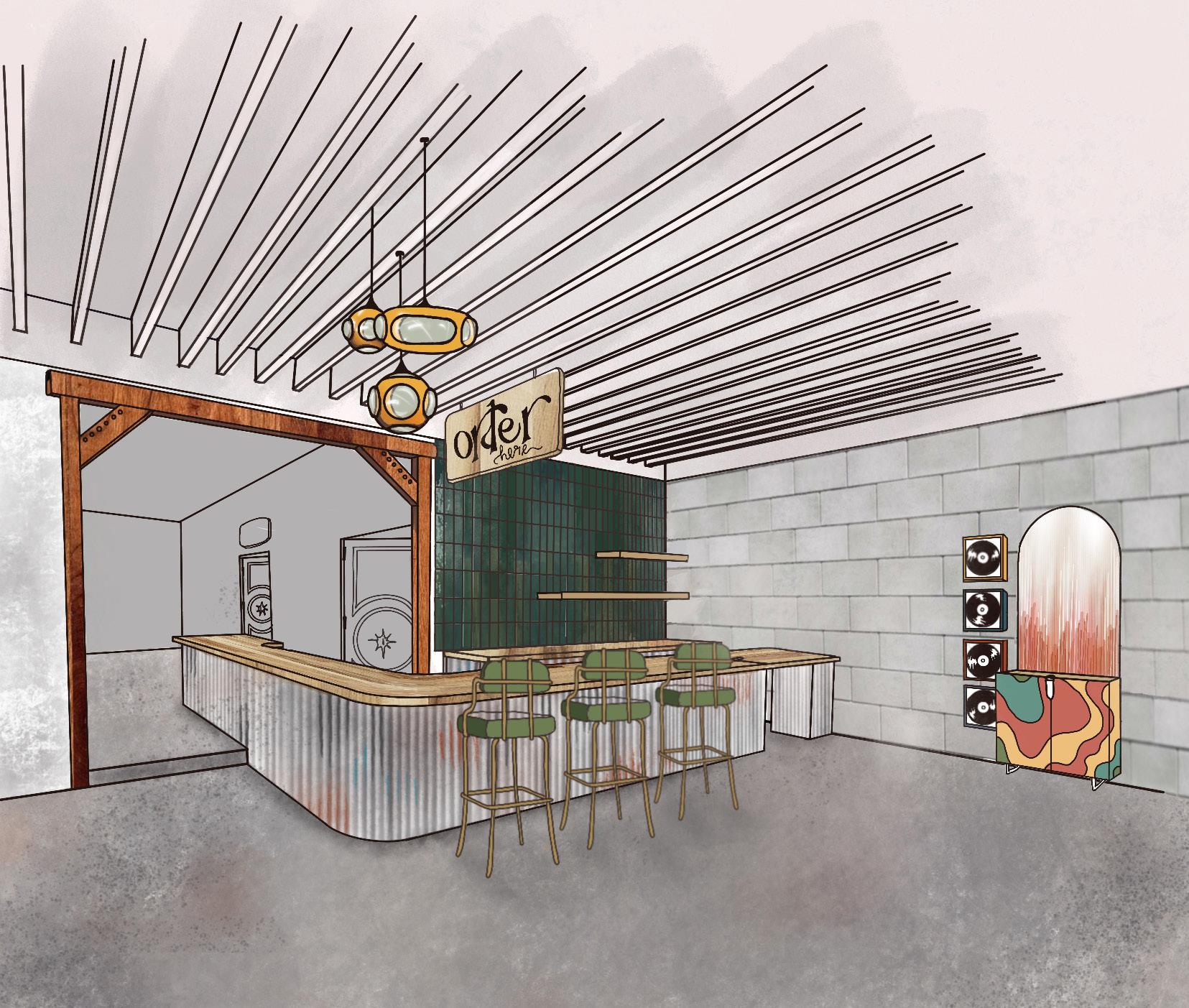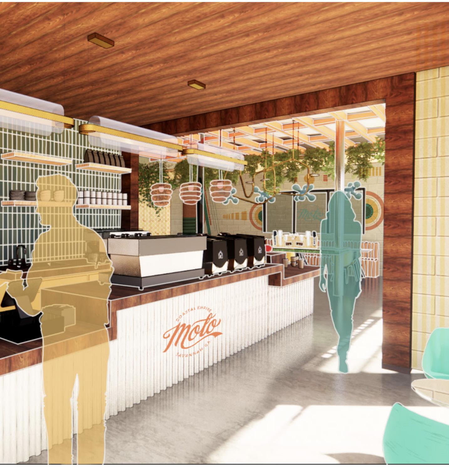 The coffee bar is located at the entrance of the site, and wraps around into the first bay area to create cohesion between the two rooms. Bar seating is located at the end of the counter, and provides an opportunity for community and connection..