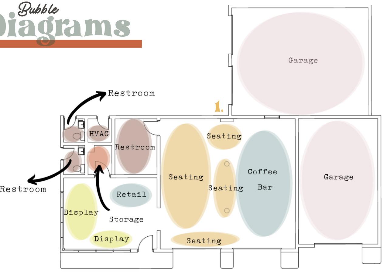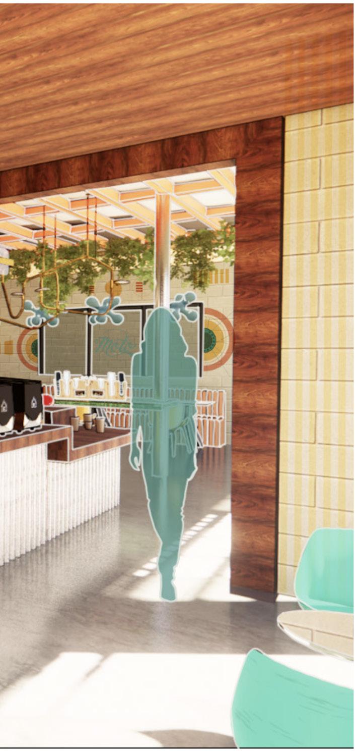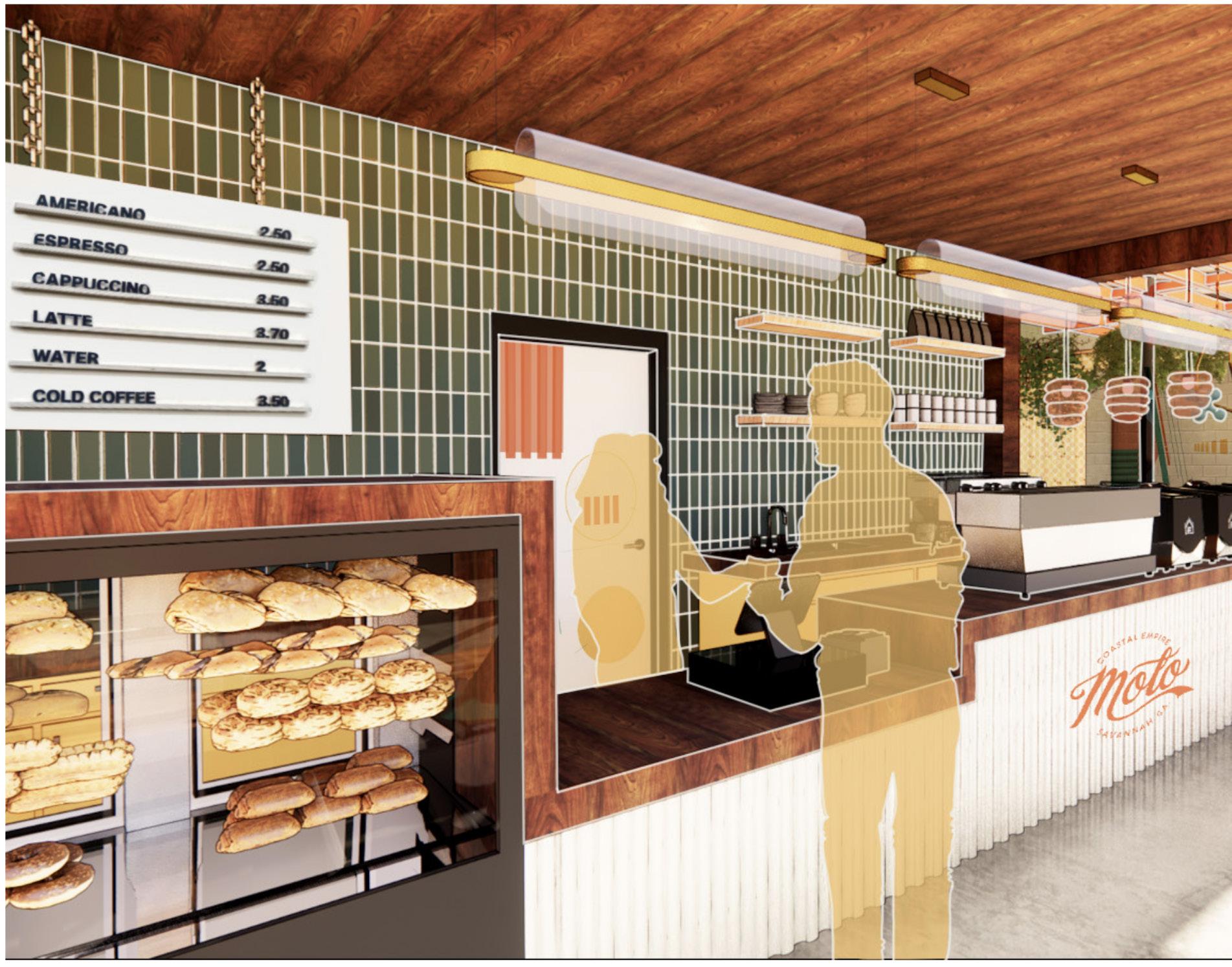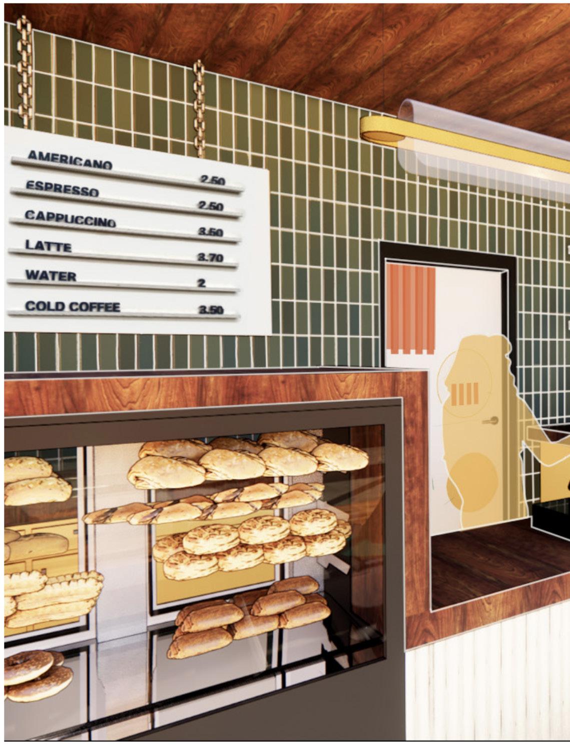 The coffee bar is located at the entrance of the site, and wraps around into the first bay area to create cohesion between the two rooms. Bar seating is located at the end of the counter, and provides an opportunity for community and connection..