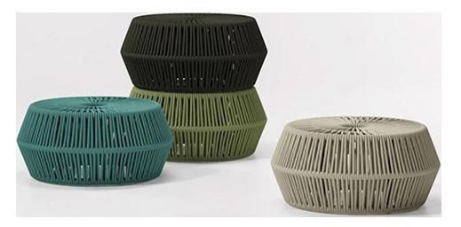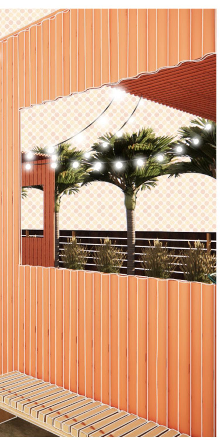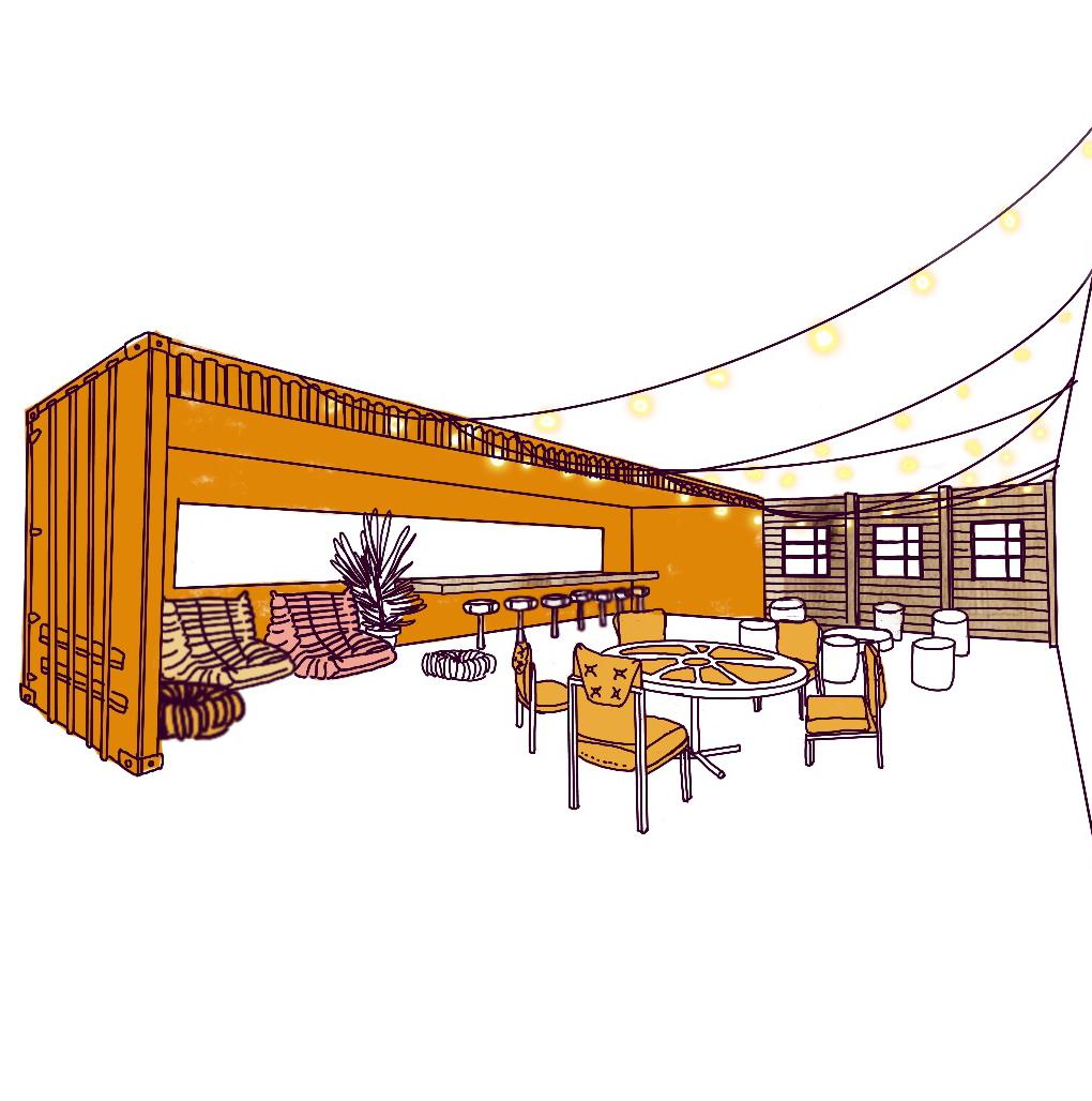 Refurbished shipping containers, customized to create sheltered outdoor seating spaces. Painted to match interior ceiling/garage color scheme.