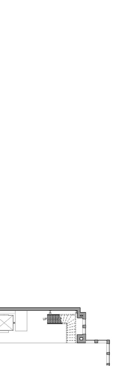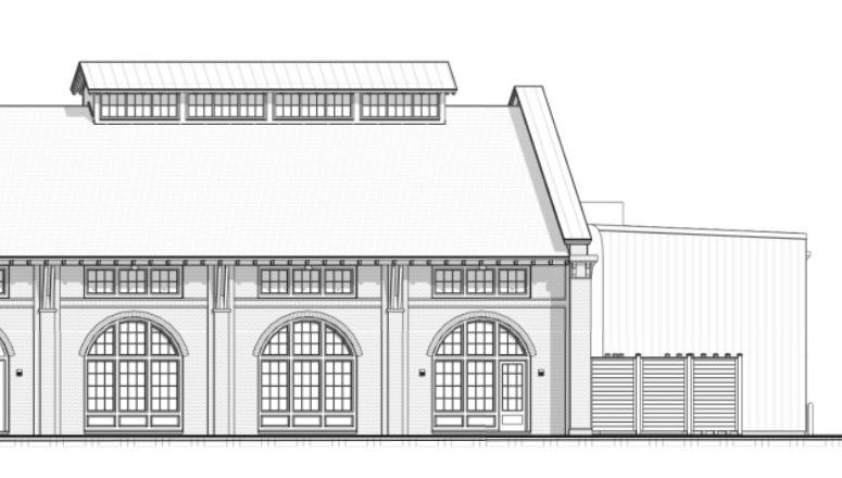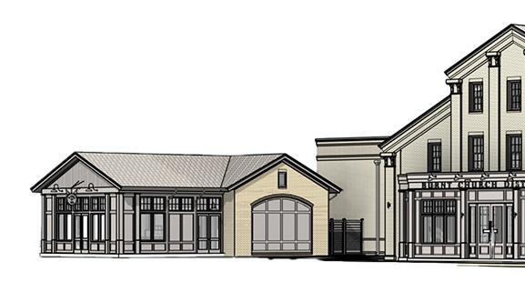 Outdoor circulation path, wraps around to the front of building and guides customers to the point of entry to the cafe area.