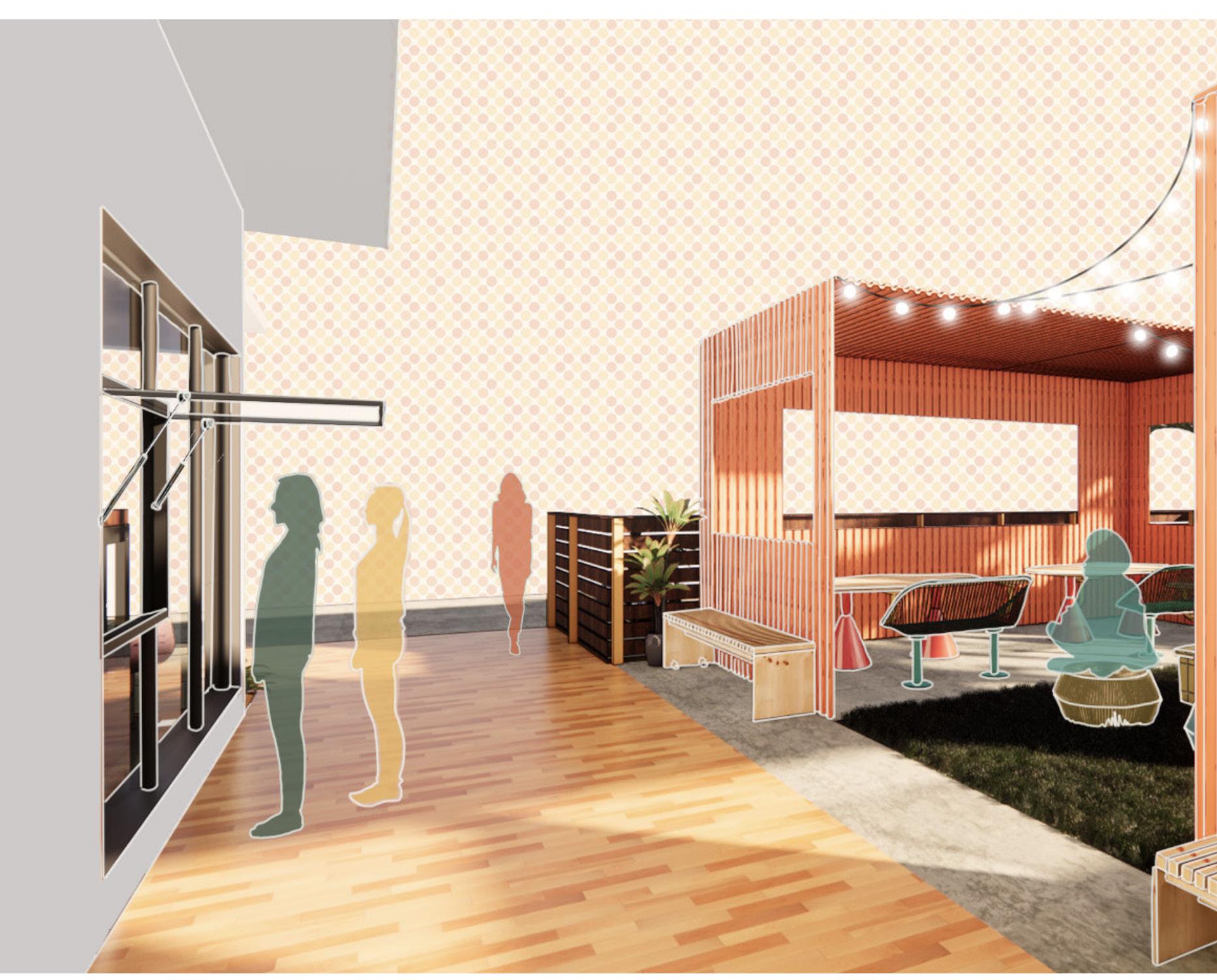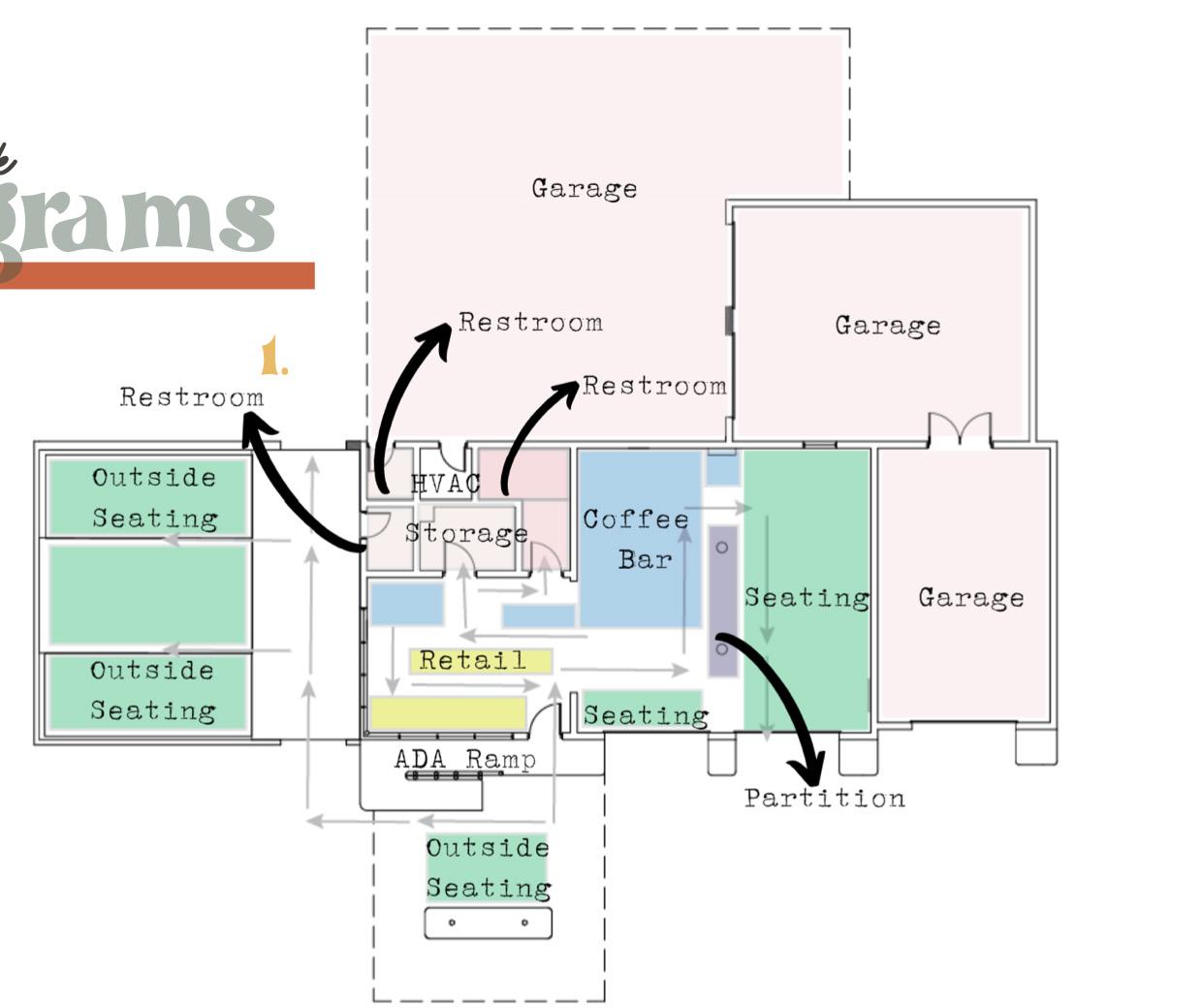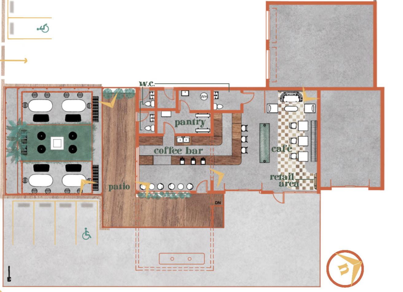 The outdoor courtyard offers additional seating for the cafe, while also providing a larger space for community gatherings and events. The To-Go window is directly adjacent to the courtyard, allowing customers the option of a quick take-away beverage.