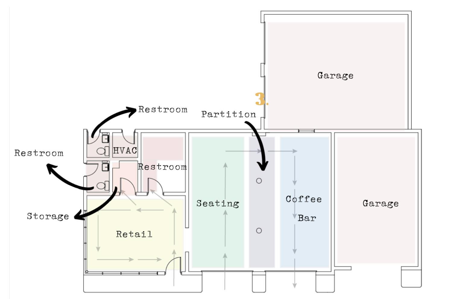 Access to the back of house storage area. To-Go window (*not pictured) located at the left end of the Coffee Bar.