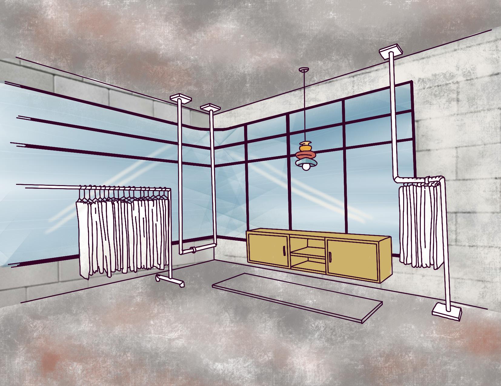A custom pegboard wall extends from the ceiling element, offering hanging space and shelving for merchandise. The two structural columns act as support for the condiment station, which doubles as a channel for customer circulation.