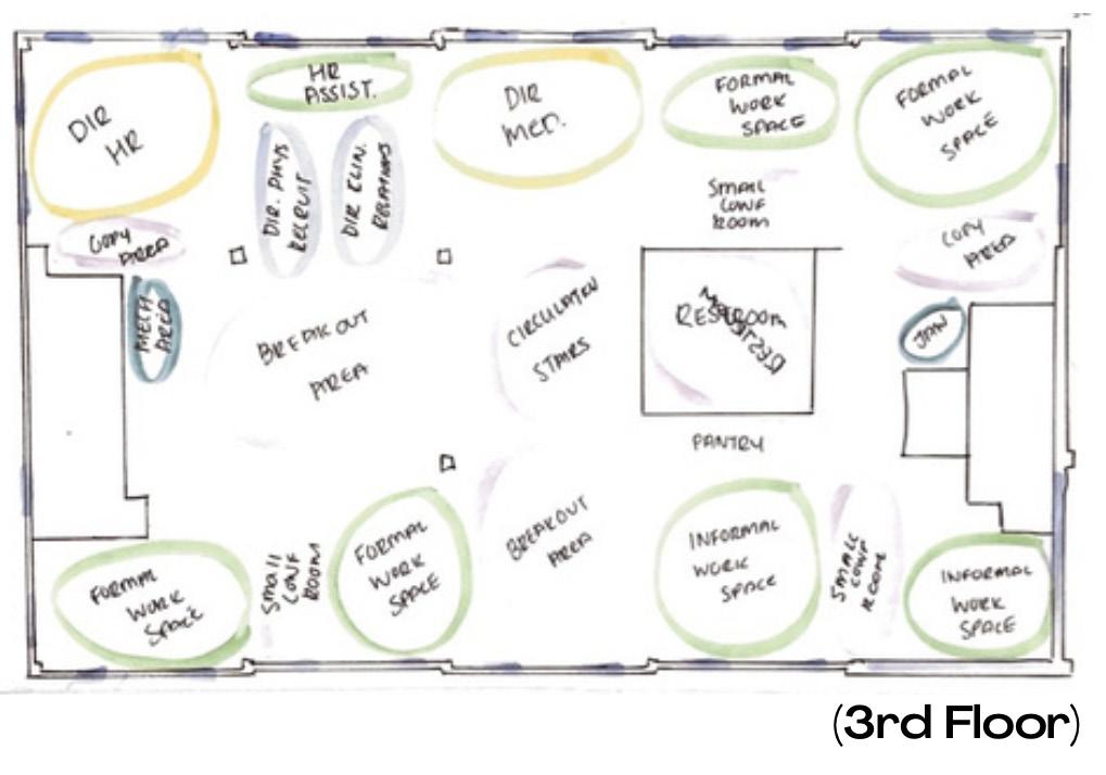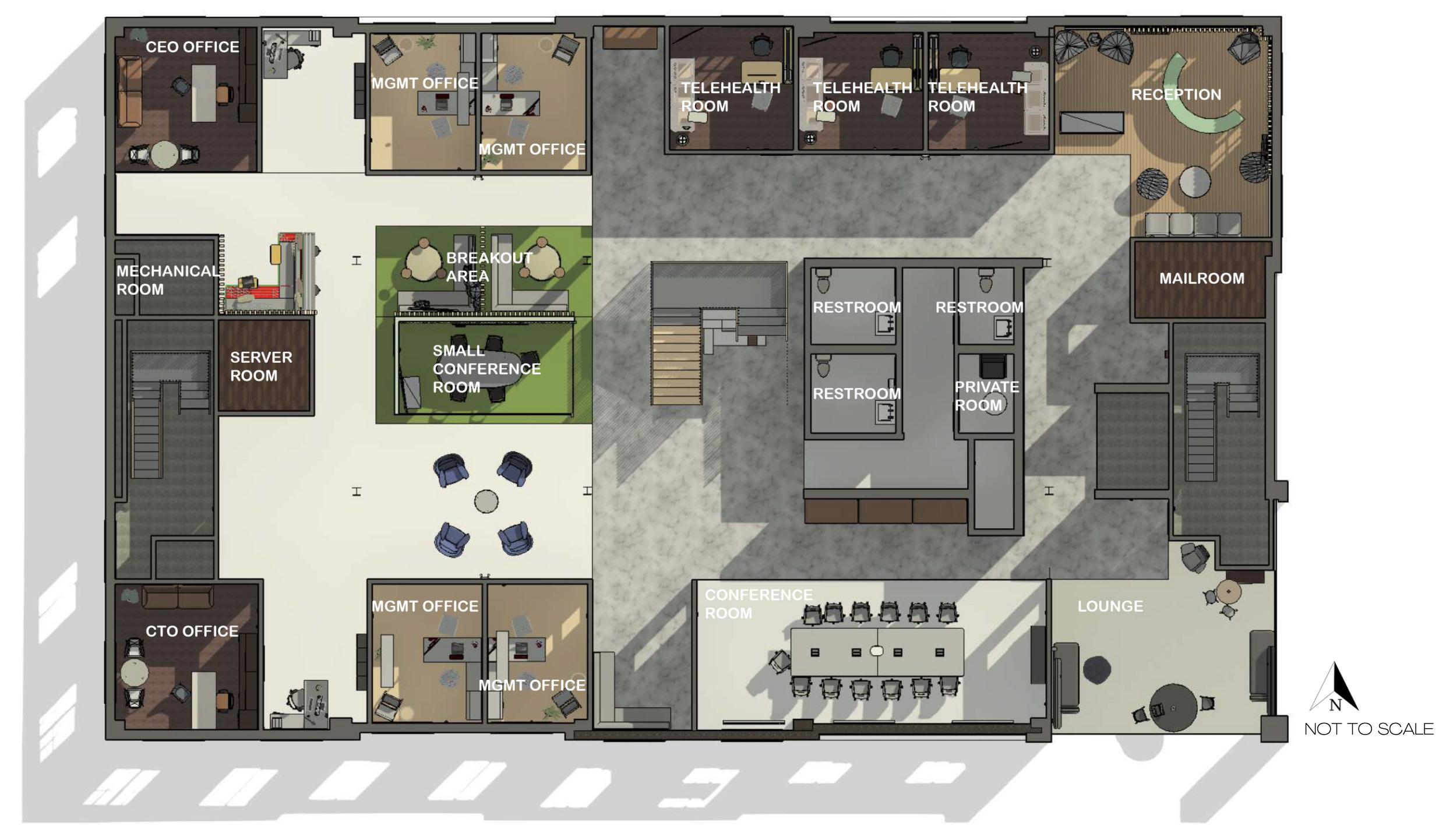This workplace design is meant to provide a functional working environment for a virtual tele-health practice. The objective of this project was to create a space where elements come together, converging or meeting at one point to make a fused composition. By anchoring the design at a central point in the building, different elements will branch off to create spaces that cater to all individuals.