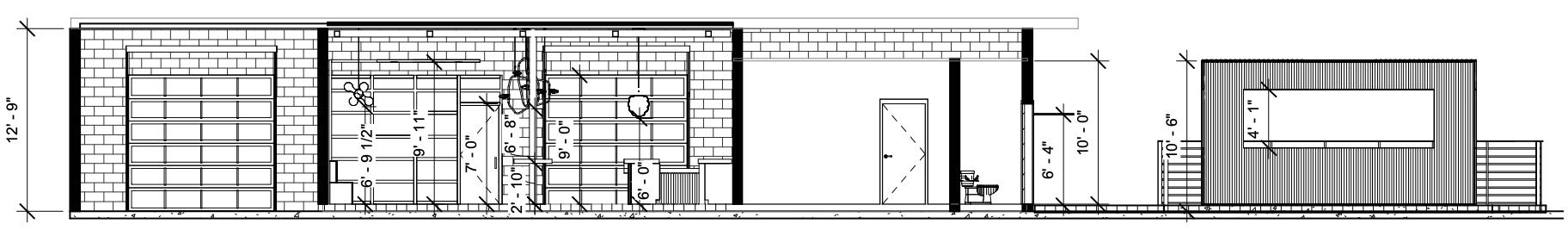 Hallway to the back of house and restroom area. Partioned off by the corrogated glass wall.