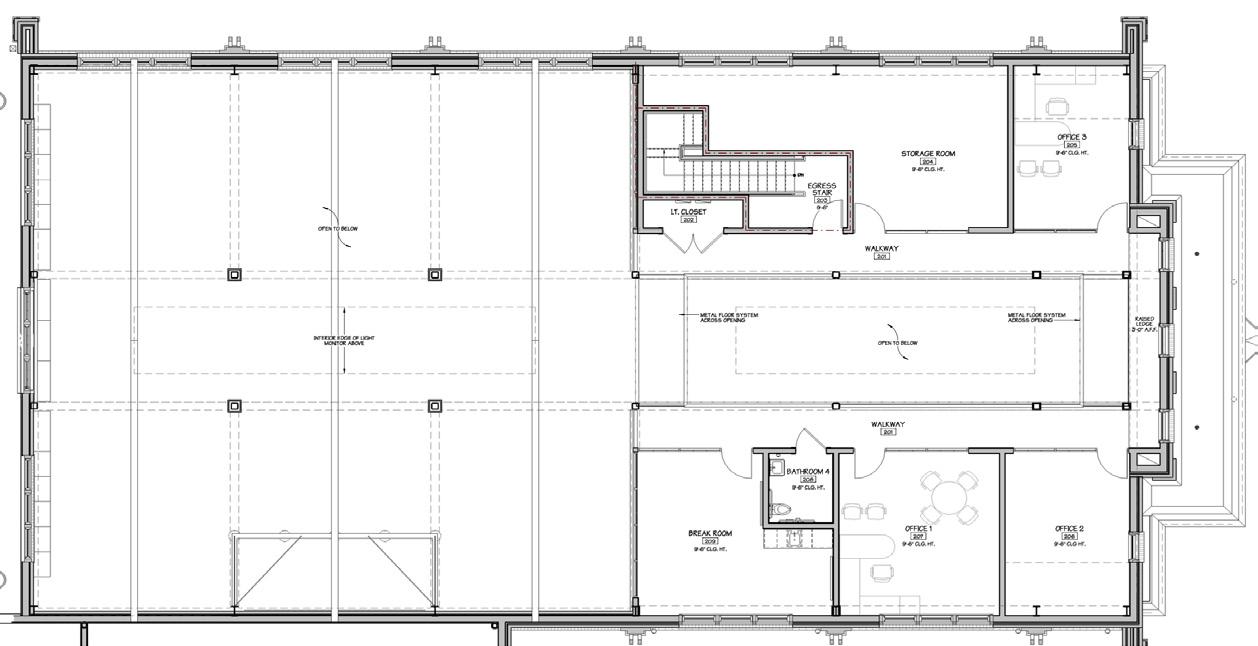 This custom seating area offers a private breakout area for employees, and is located directly adjacent to the conference room. The location of the space offers immediate access to the circulation hallway, as well as the circulation stairs located to the left.