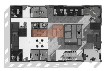 This custom seating area offers a private breakout space, and is located directly adjacent to the conference room. The space offers immediate access to the circulation hallway, as well as the circulation stairs located to the left. Custom Wood