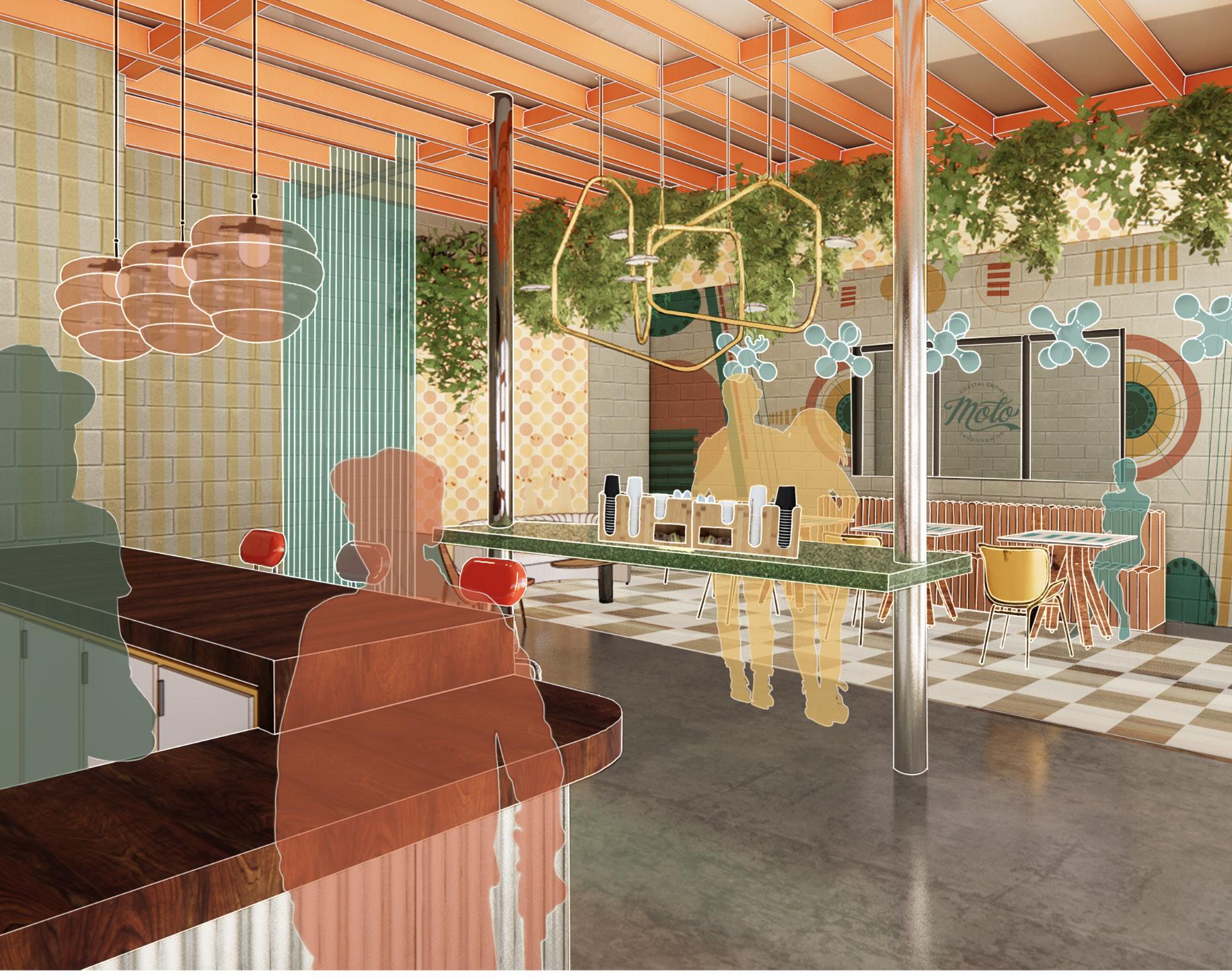 The goal of this design was to transition an existing vintage motorcycle service site into a dual purpose space that combines bike expertise with a fully functioning coffee shop. By blending industrial elements with eccentric finishes and detailing, the revivalist nature of the shop is embodied throughout the space.