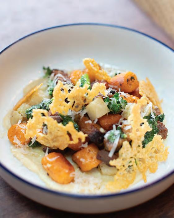 OUR SPECIALTY: Gnocchi, caulilini (baby Japanese cauliflower), broccoli rabe, pork belly and parsnip puree with parmesan. The gnocchi is house-made, and the sweet potatoes are from Bradford Farm. We roast the vegetables separately and render the pork belly until crispy. We heat it all together and place the mixture perfectly on the parsnip puree and finish with parmesan!