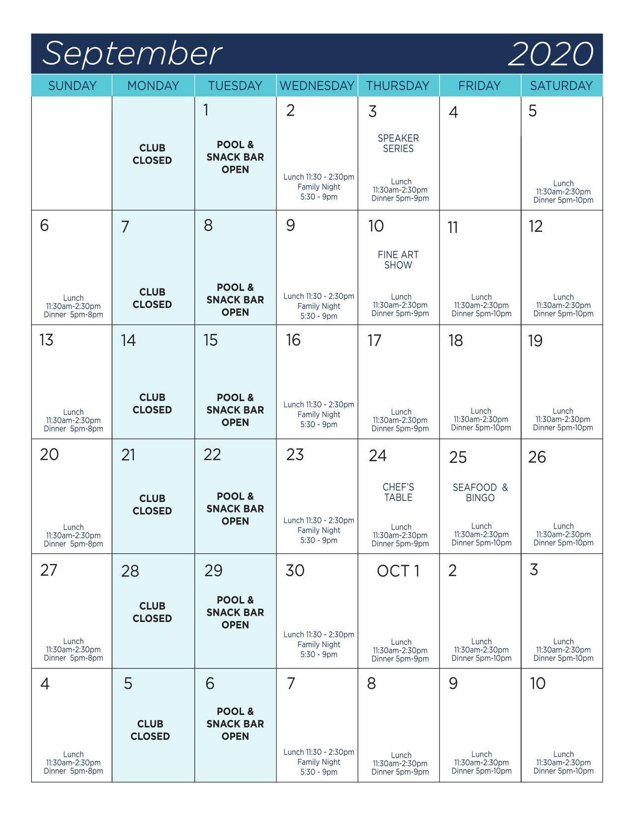 August 202016 17 18 19 20 2123 24 25 26 27 28 29CLUB POOL& BOURBON & CLOSED SNACKBAR BBQ11:30 - 2:30pm30 31 SEPT 1 2 3 4 5CLUB POOL& CLOSED SNACKBARSpm-8pm 5:30 - 9pm11:30am-2:30pm
