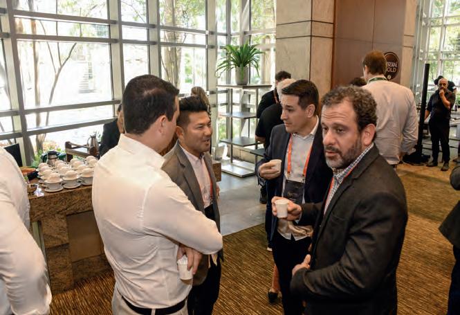 01. Redes do Estado de São Paulo colocaram a conversa em dia durante o intervalo das palestras (da esq. para a dir.): Teder Senis, gerente comercial do Confiança; Eric Shibata, sócio-proprietário do Shibata; Eduardo Amaral, diretor comercial do Confiança; e Rafael Gonçalves, diretor comercial do Jaú Serve