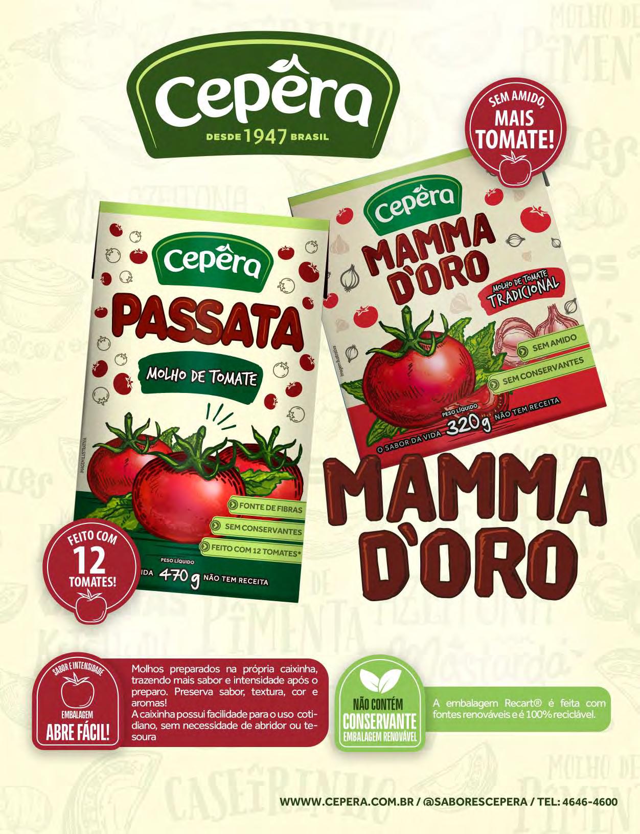 “São molhos de tomate premium, em embalagem pouch, resultado de colab entre Cepêra e Unilever. Diferentemente dos produtos low price, que tiram valor da categoria, criamos um portfólio impactante para fazer parte de cada vez mais refeições dos brasileiros e buscar o top 3 da categoria, ajudando o varejo a elevar ticket médio e rentabilidade” ANA CAROLINA PENTEADO, Gerente de Marketing da Cepêra