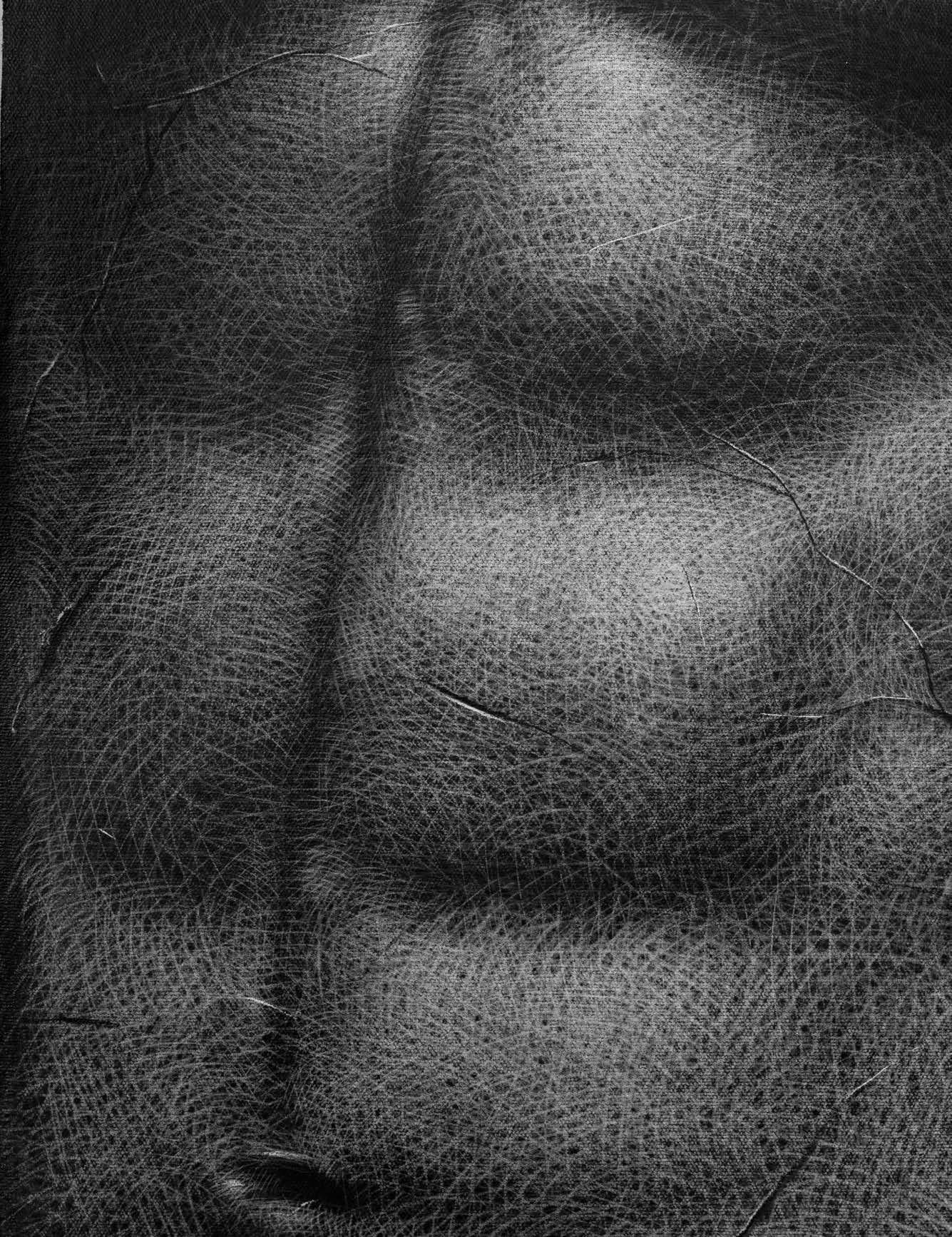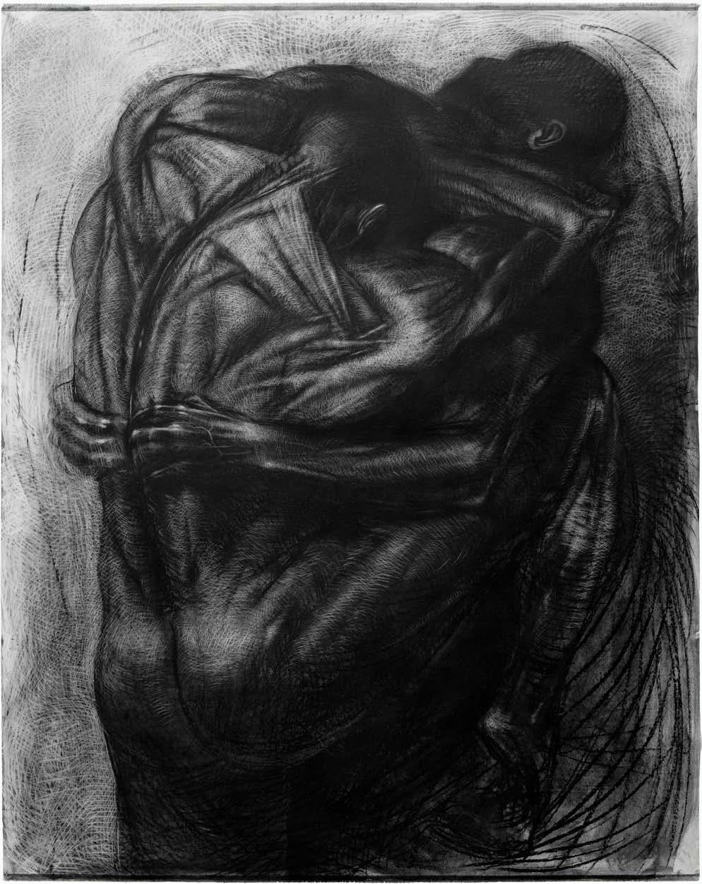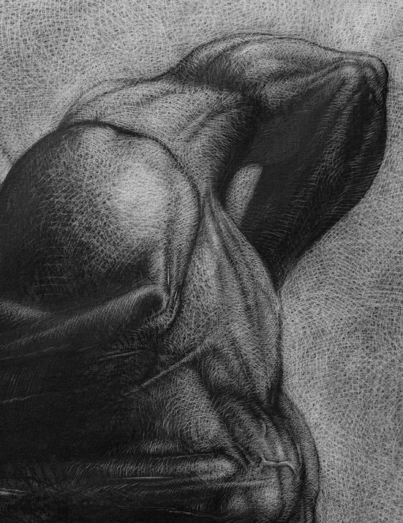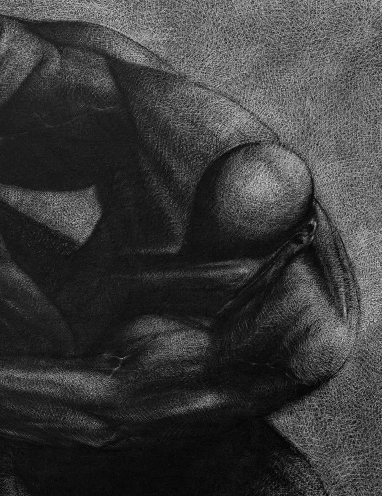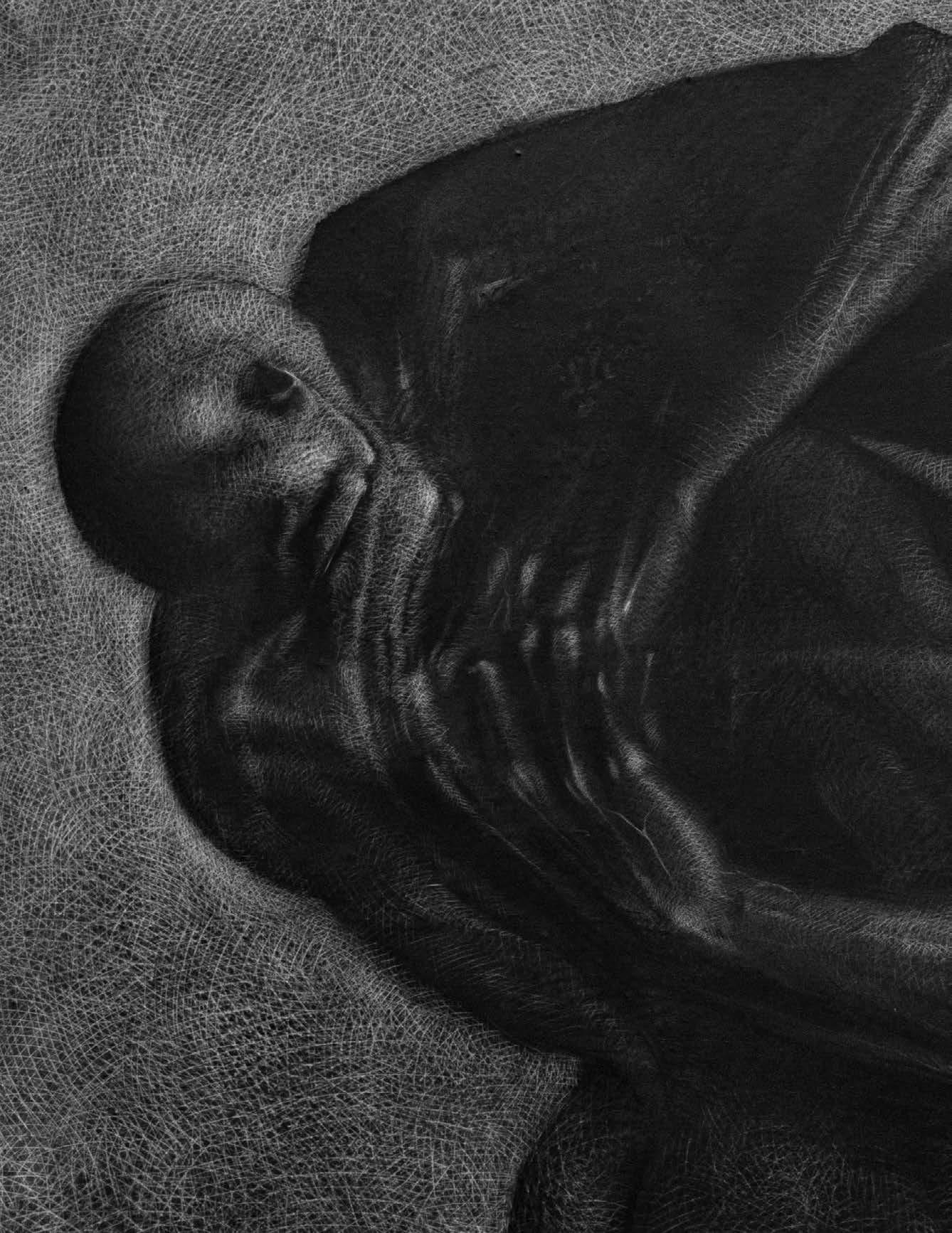 In the works of Vasyl Savchenko, the body (muscles, skin, curves, and outlines) becomes a mediator of deep experiences of individual (microcosm) and universal (macrocosm) significance, blending the human with the divine, the temporal with the eternal. According to Maurice Merleau-Ponty, “my body is a movement toward the world, and the world is the point of support for my body”². These words are visualized by the artist in a myriad of tonalities, ranging from black to white, in the passionate charcoal mezzotint technique.