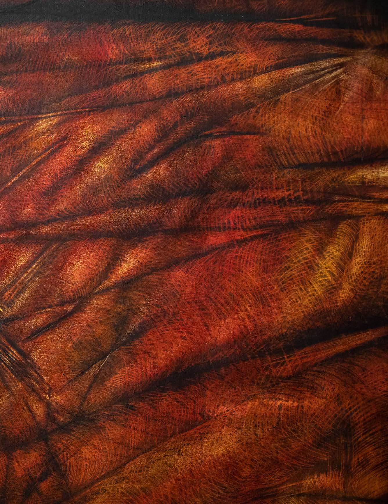 “Perhaps someday I will assemble this Colossus, though maybe not,” reflects Vasyl. The artist continues to create these fragments of an enormous body, uncertain of what they will become or if they will eventually come together into a finished image. Only one thing is clear: each new piece will be different, whether it’s colorful, adorned with tattoos, or marked with scars. In one way or another, the muscles that peek through, breaking through the skin, gradually weave into a complex lace, transforming individual fragments into a cohesive canvas.