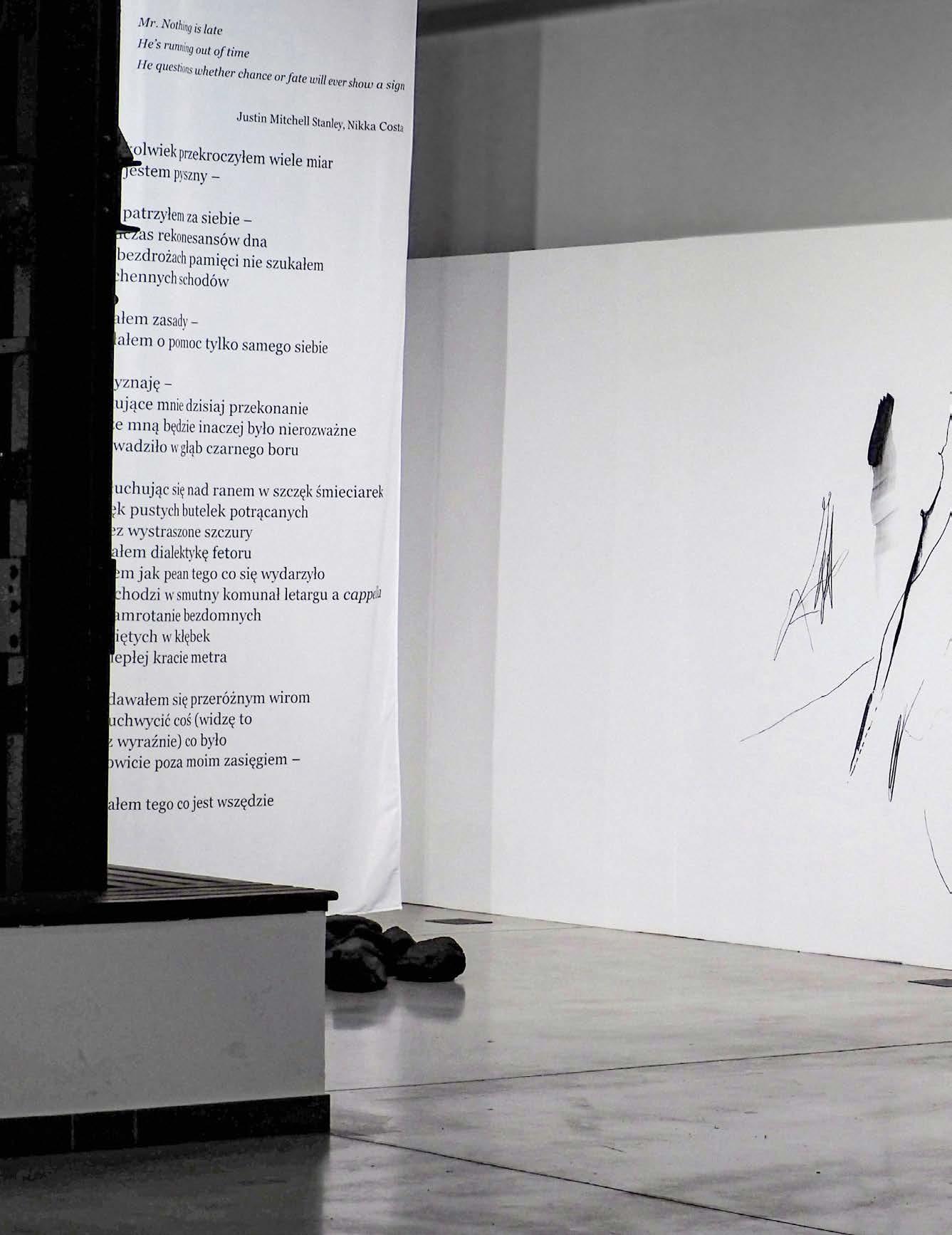 węgiel na papierze, 200 × 400 cm, 2018. Wsparcie przez: Akademia Sztuk Pięknych im. Eugeniusza Gepperta we Wrocławiu. Miejsce: Wrocław, Polska. Praca była częścią prezentacji pracy magisterskiej na Akademii Sztuk Pięknych im. Eugeniusza Gepperta we Wrocławiu.