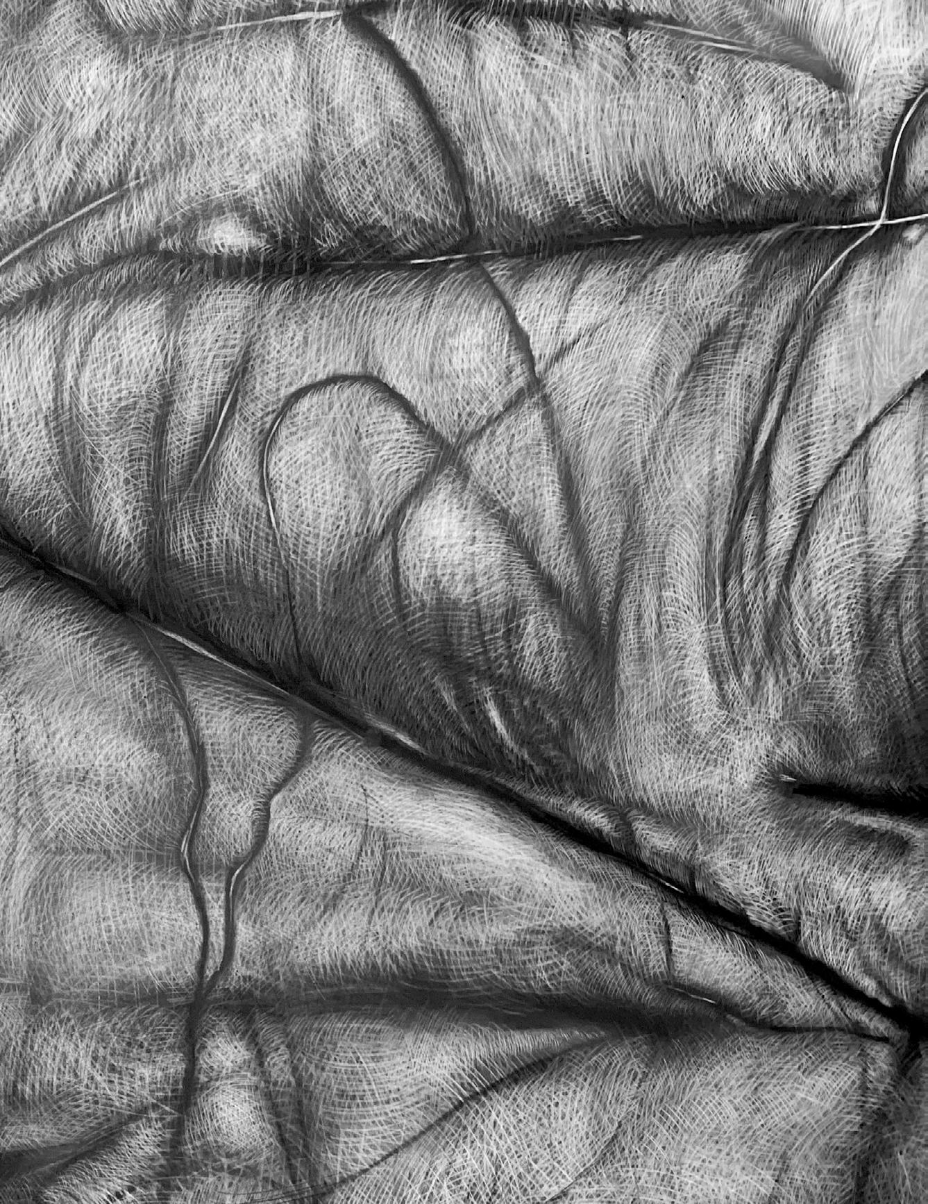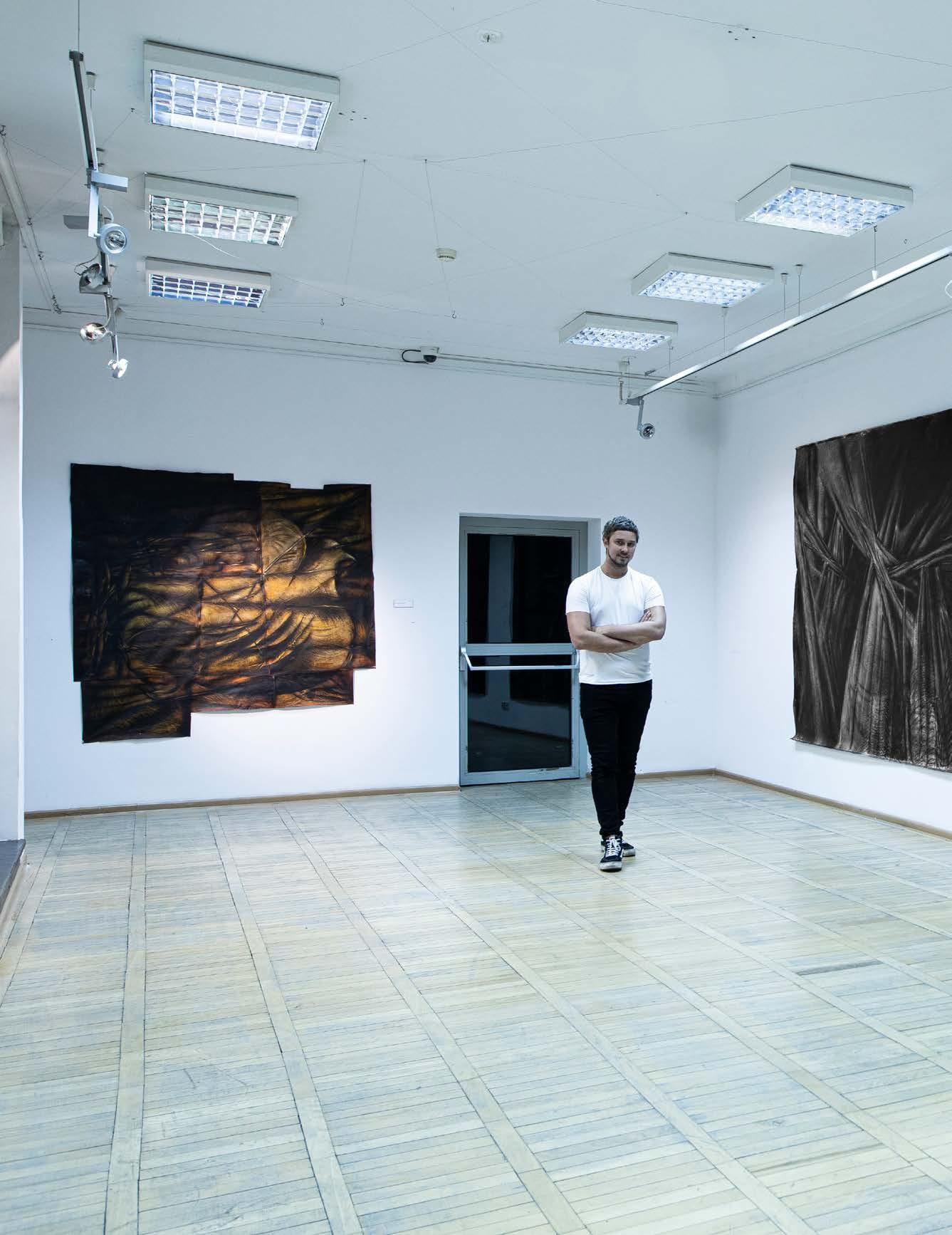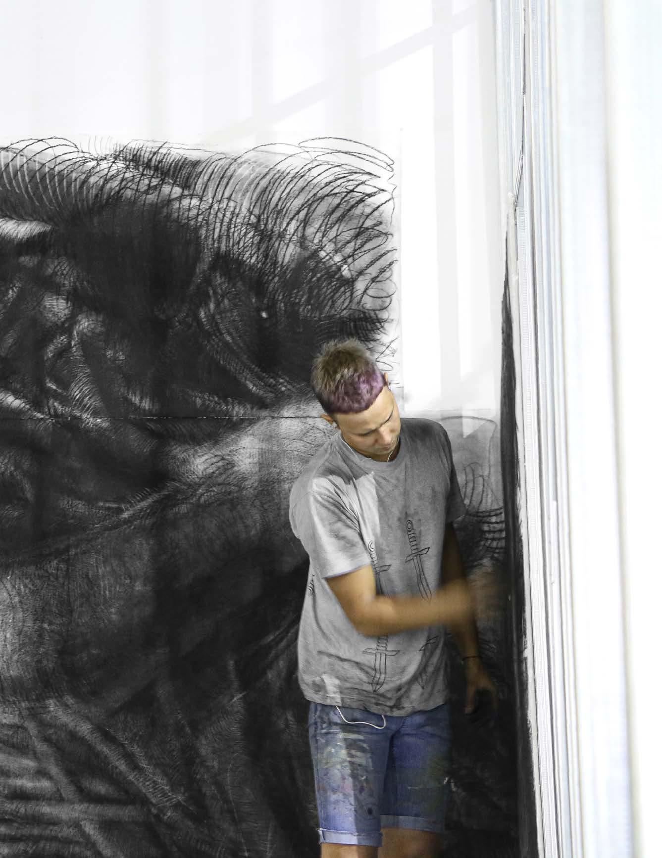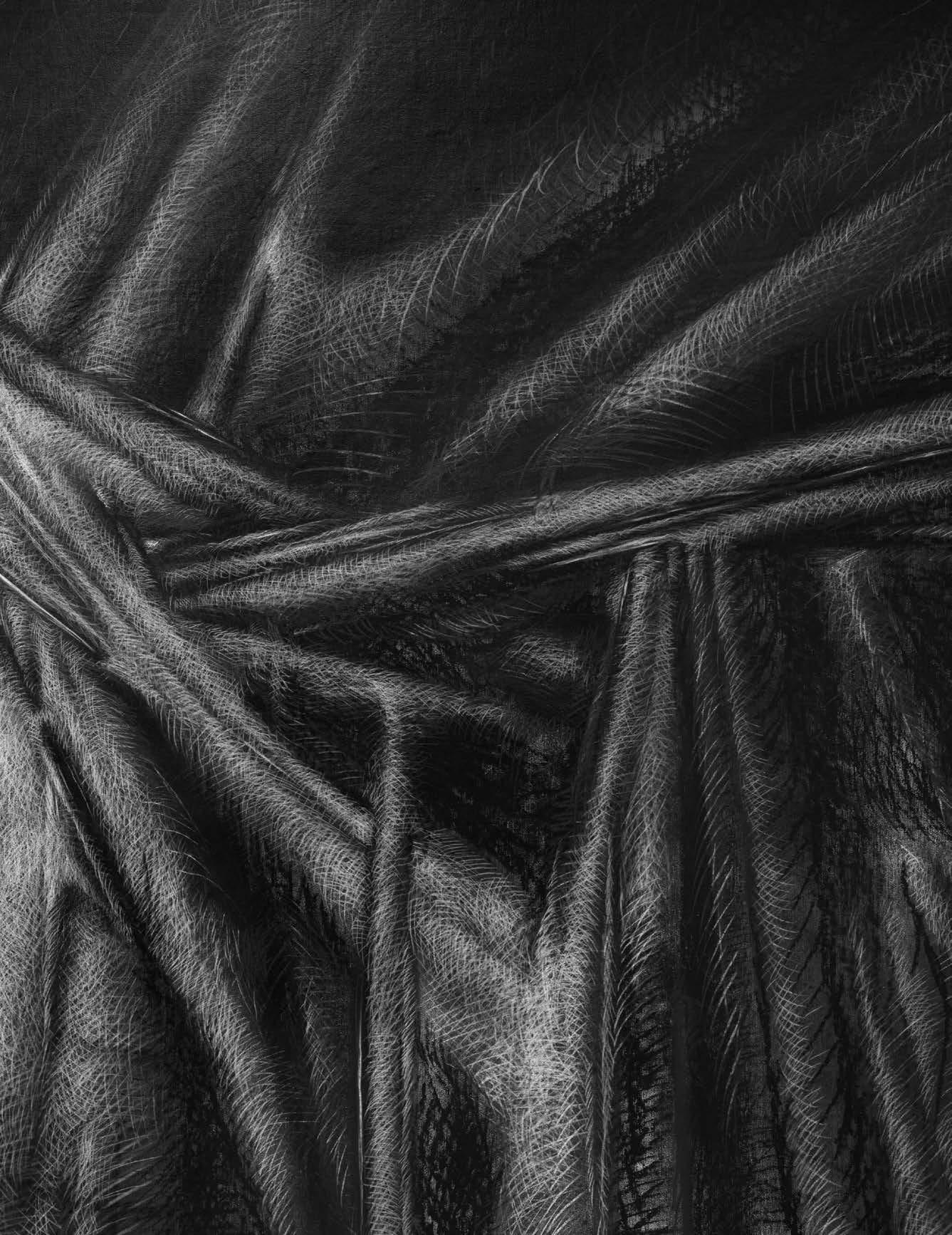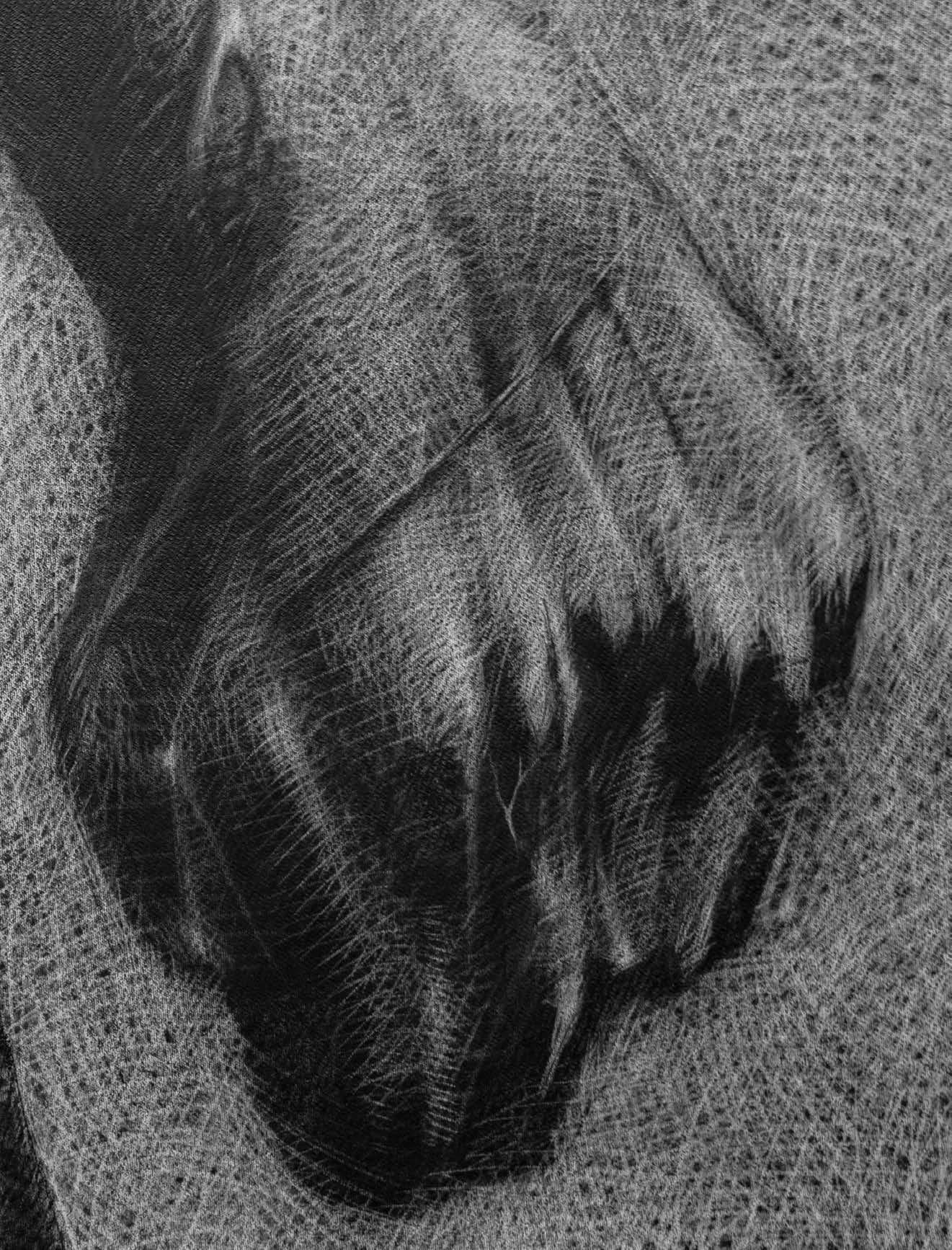 This is facilitated by the artist’s favorite medium - charcoal, as it provides a wide range of possibilities and tactile sensations in the work. Drawing inspiration from the classical mezzotint technique, known for its smoothness and sleekness, Vasyl focuses on “drawing tonalities from black to white,” infusing intensity and spontaneity into this practice, creating a passionate, vivid, pulsating image that blurs the boundaries between graphics and painting.