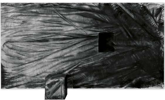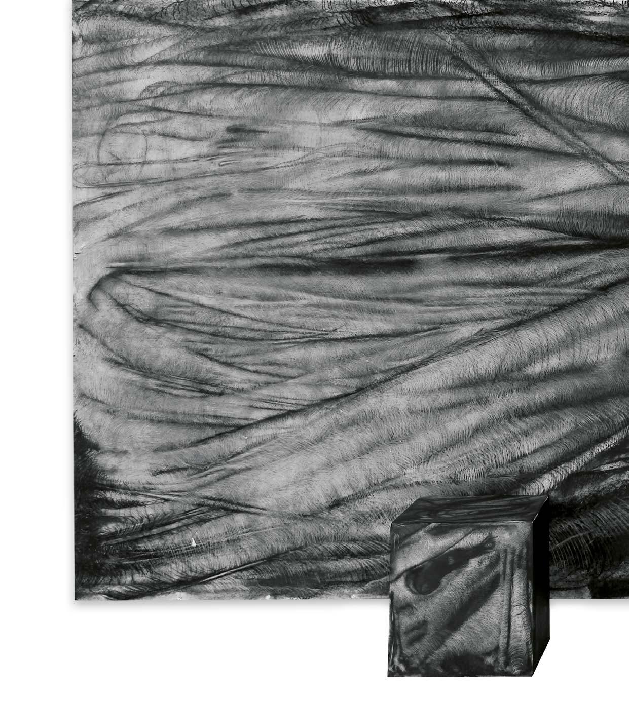 charcoal on paper, 200 × 400 cm (cube object 50 × 50 × 50 cm). Supported by: Eugeniusz Geppert Academy of Fine Arts in Wroclaw. Place: Wroclaw, Poland. Work was part of Master Degree presentation in Eugeniusz Geppert Academy of Fine Arts, in Wroclaw, Poland