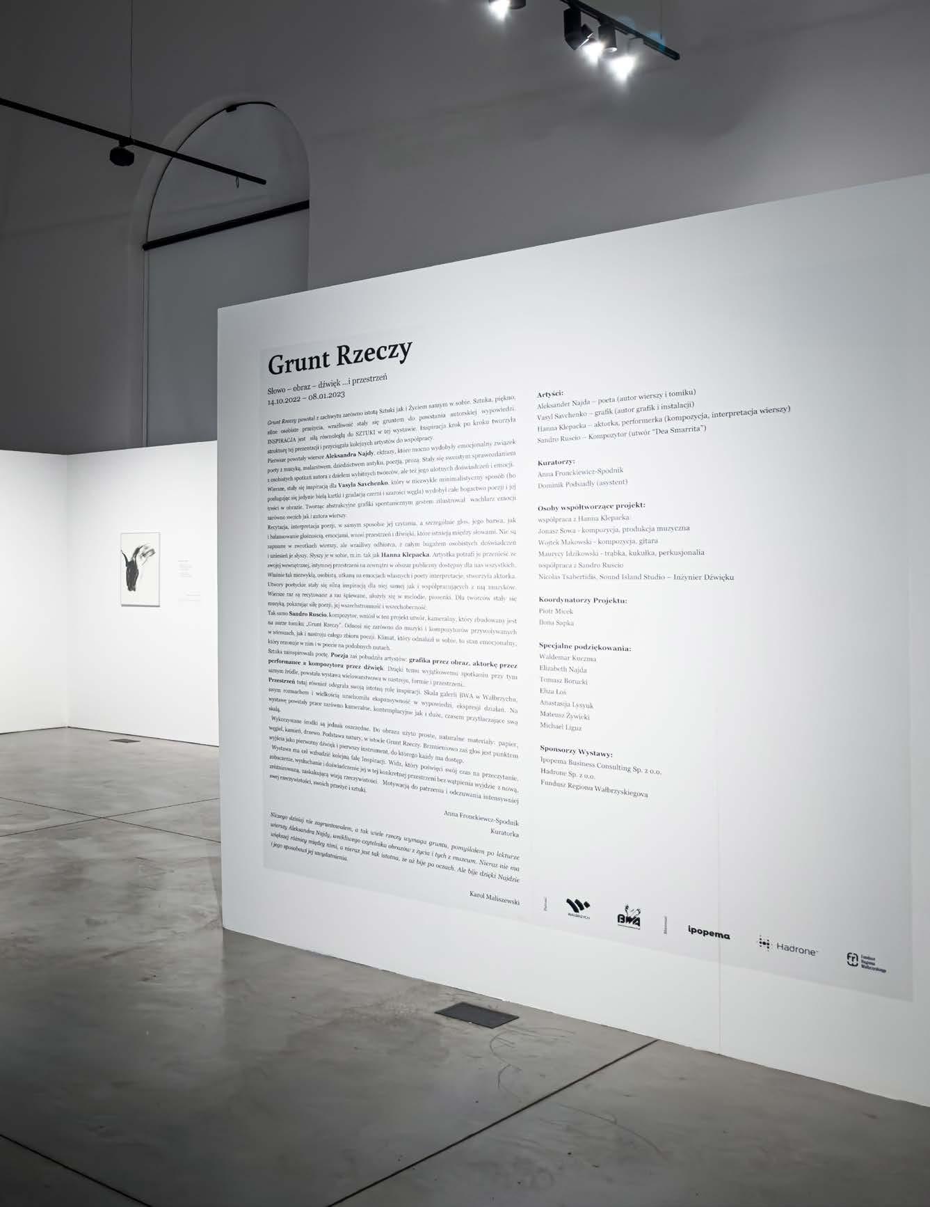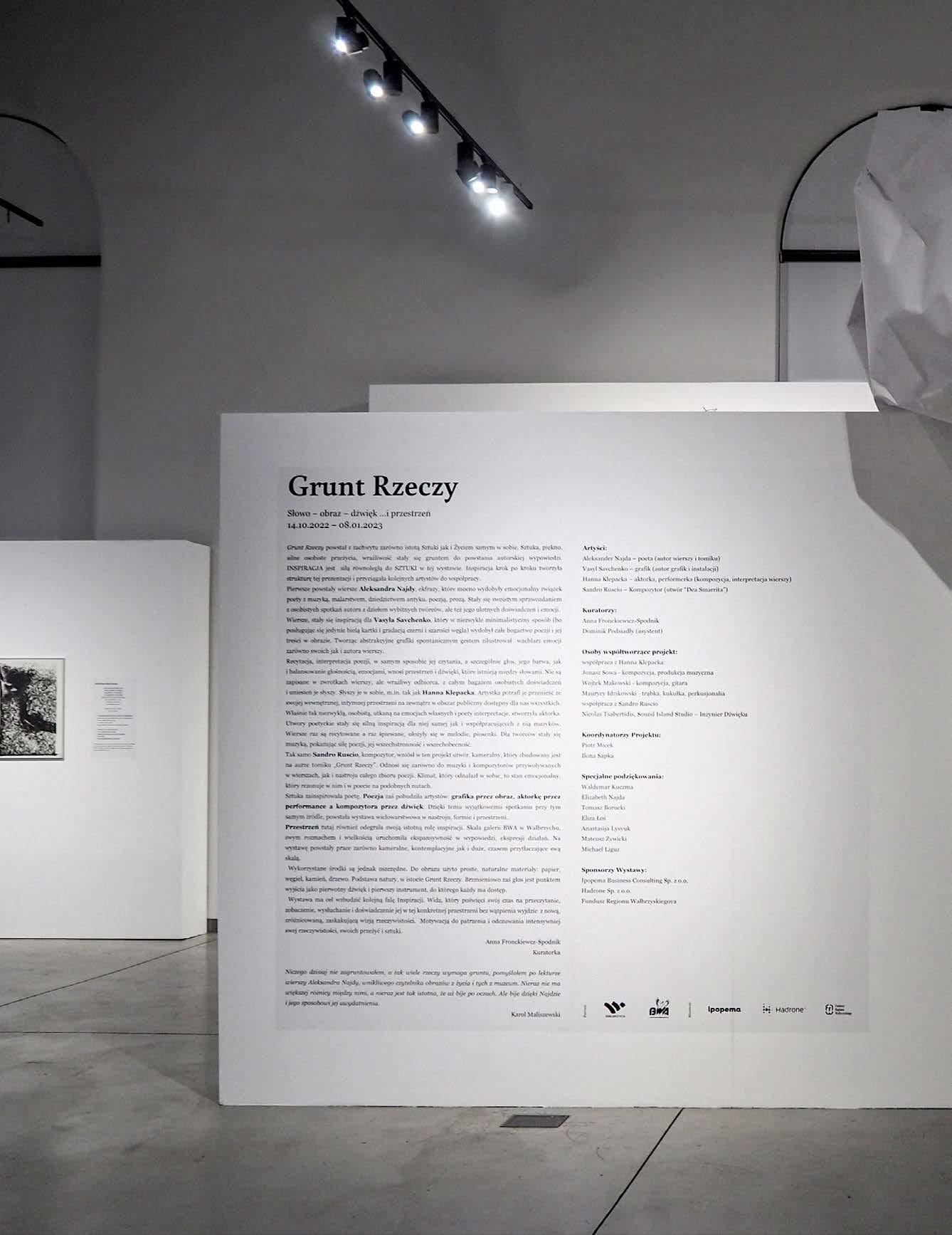 Wystawa Grunt Rzeczy jest efektem współpracy poety z artystą plastykiem. U jej podstaw leżą wiersze Aleksandra Najdy oraz grafiki Vasyla Savchenki. Współpraca, której jesteśmy świadkami, rozpoczęła się dwa lata temu. Poeta dzielił się wierszami z multimedialnym artystą wizualnym, który pod ich wpływem stworzył serię spokrewnionych prac węglem, później przeniesionych na sitodruk.