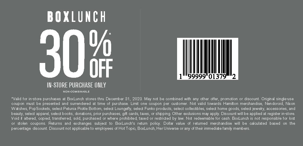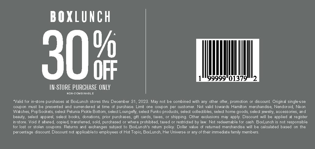 *Valid for one-time use only on purchases made at BoxLunch stores thru December 31, 2024. Original single-use coupon must be presented and surrendered at time of purchase. Limit one coupon per customer. May not be combined any other offers, coupons, promotions, or discounts. Not valid towards select Funko products, donations, prior purchases, gift cards, taxes, or shipping. Discount has no cash value and is not redeemable for cash. Discount will be applied at register in-store. Void if altered, copied, transferred, sold, purchased, or where prohibited, taxed, or restricted by law. Not redeemable for cash and BoxLunch is not responsible for lost or stolen coupons. Dollar value of returned merchandise will be calculated based on the percentage discount. Not applicable to Hot Topic, BoxLunch, or Her Universe employees. BoxLunch reserves the right to modify or end this promo at any time.