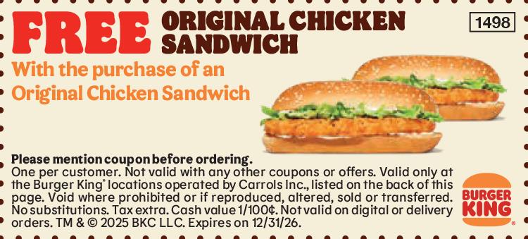 FREE PULLED PORK SANDWICH, PULLED CHICKEN SANDWICH OR Q BBQ SALAD WITH THE PURCHASE OF A PULLED PORK SANDWICH, PULLED CHICKEN SANDWICH OR Q BBQ SALAD OF EQUAL OR GREATER VALUE. Up to $12.00 value.
