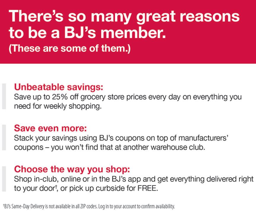 All BJ’s memberships are subject to BJ’s current membership terms, ask in-club or go to BJs.com/terms.