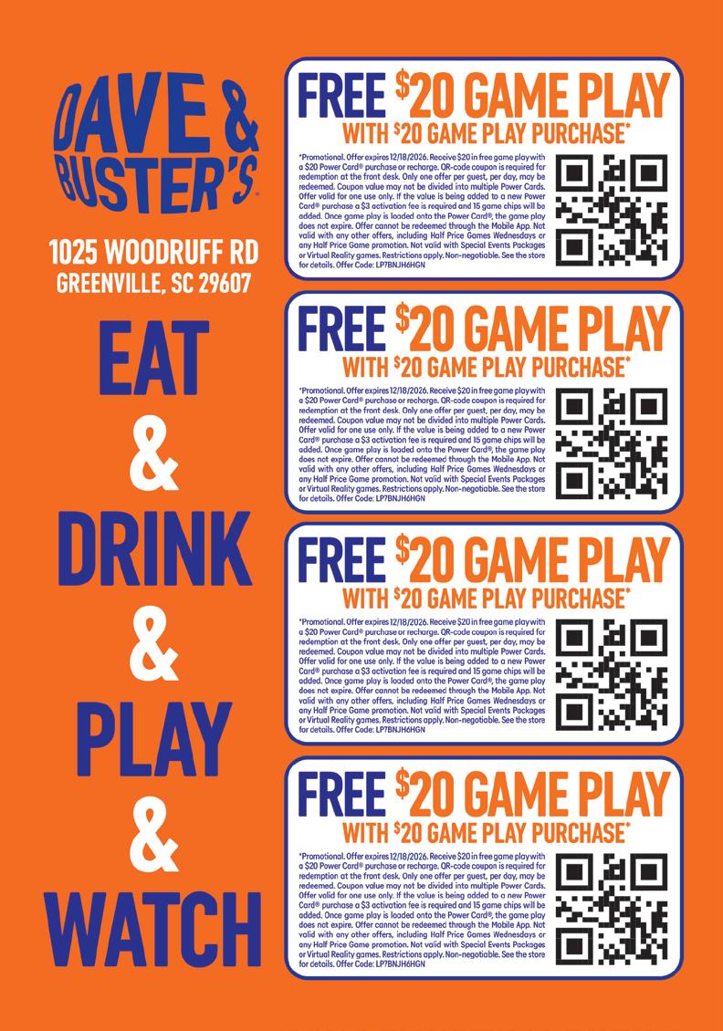 *BUY ONE (1) ADULT GAME, GET ONE (1) FREE FOOD ITEM UP TO $12 IN VALUE. $3 RESERVATION CONVENIENCE FEE REQUIRED. MUST SURRENDER COUPON UPON USE. RESERVATIONS RECOMMENDED. NOT VALID WITH BIRTHDAYS, CORPORATE, OR HOLIDAY EVENTS. OFFER SUBJECT TO CHANGE AT ANYTIME.