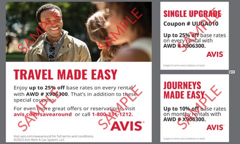 N11 TRAVEL MADE EASY Enjoy up to 25% off base rates on every rental with AWD # X906300 . That’s in addition to these special coupons. For even more great offers or reservations, visit avis.com/savearound or call 1-800-331-1212. Visit avis.com/savearound for full terms and conditions. ©2023 Avis Rent A Car System, LLC SINGLE UPGRADE Coupon # UUGA010 Up to 25% off base rates on every rental with AWD # X906300. Subject to terms and conditions on back. JOURNEYS MADE EASY Up to 10% off base rates on monthy rentals with AWD # X906300. Subject to terms and conditions on back. SAMPLE SAMPLE SAMPLE SAMPLE SAMPLE SAMPLE