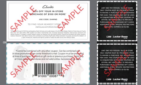 *Offer valid through 12/31/20 at participating Clarks full-price and outlet stores in the 50 United States, District of Columbia and Puerto Rico only. Not valid online. Offer applies to in-stock merchandise only. Excludes full-priced Originals, Unstructured, Bushacre and Stinson product. To redeem in-store: present coupon at checkout and use code SVARND. Cannot be combined with other coupons, codes or discounts. Not valid on taxes, prior purchases or purchase of gift cards. Other exclusions may apply, see store for details. C. & J. Clark America Inc. reserves the right to cancel or modify this offer at any time without notice.