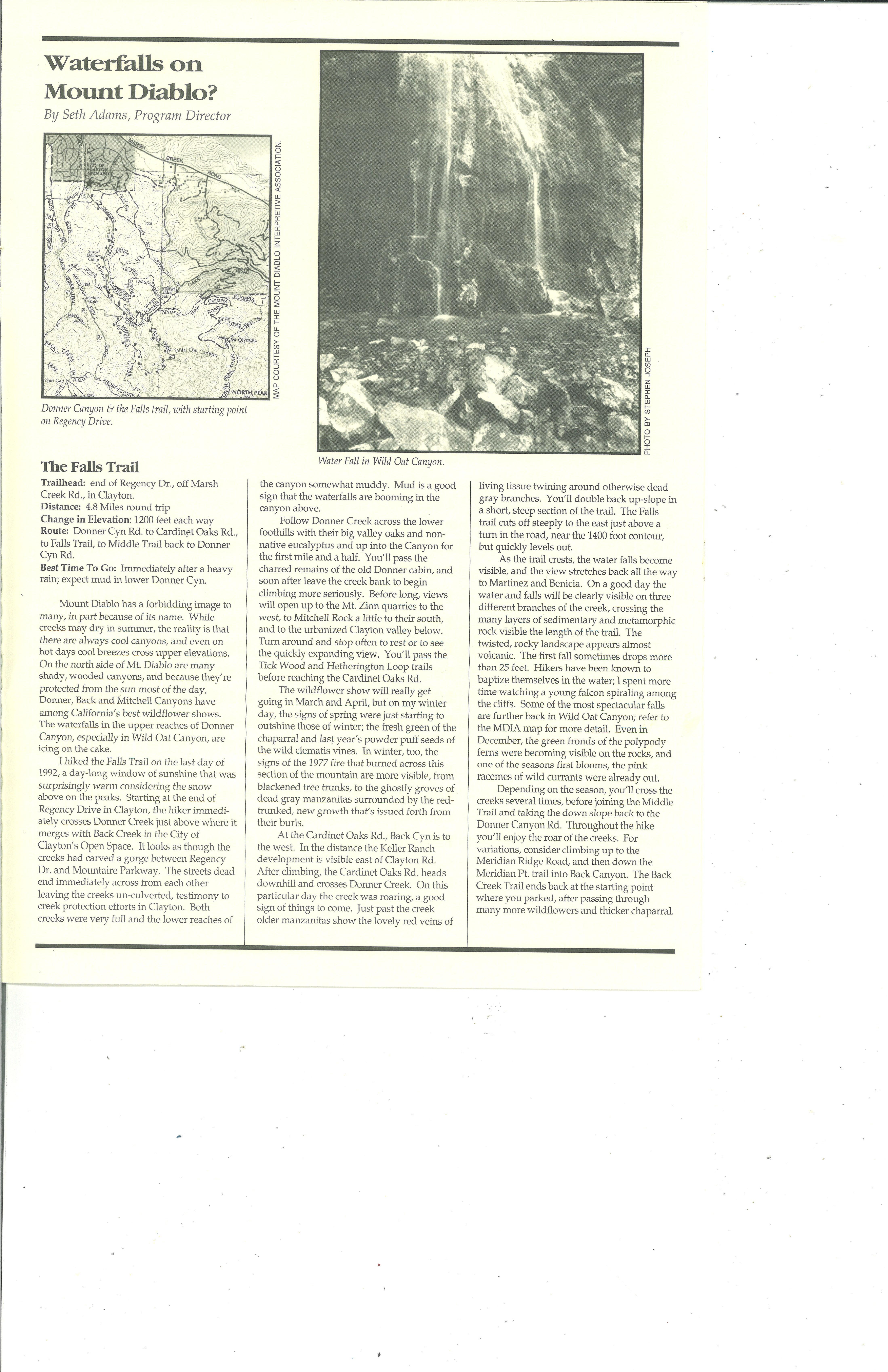 ...was created in1974 to increase the public's opportunities to learn about Mount Diablo's history and natural history. The Mount Diablo Interpretive Association (MDIA) oversees the State Park's docent programs, and produces educational materials about Mount Diablo. For more info, write: MDIA, P.O. Box 346, Walnut Creek, CA g45g7,or call Judy Adler at (510) g3g-5289.