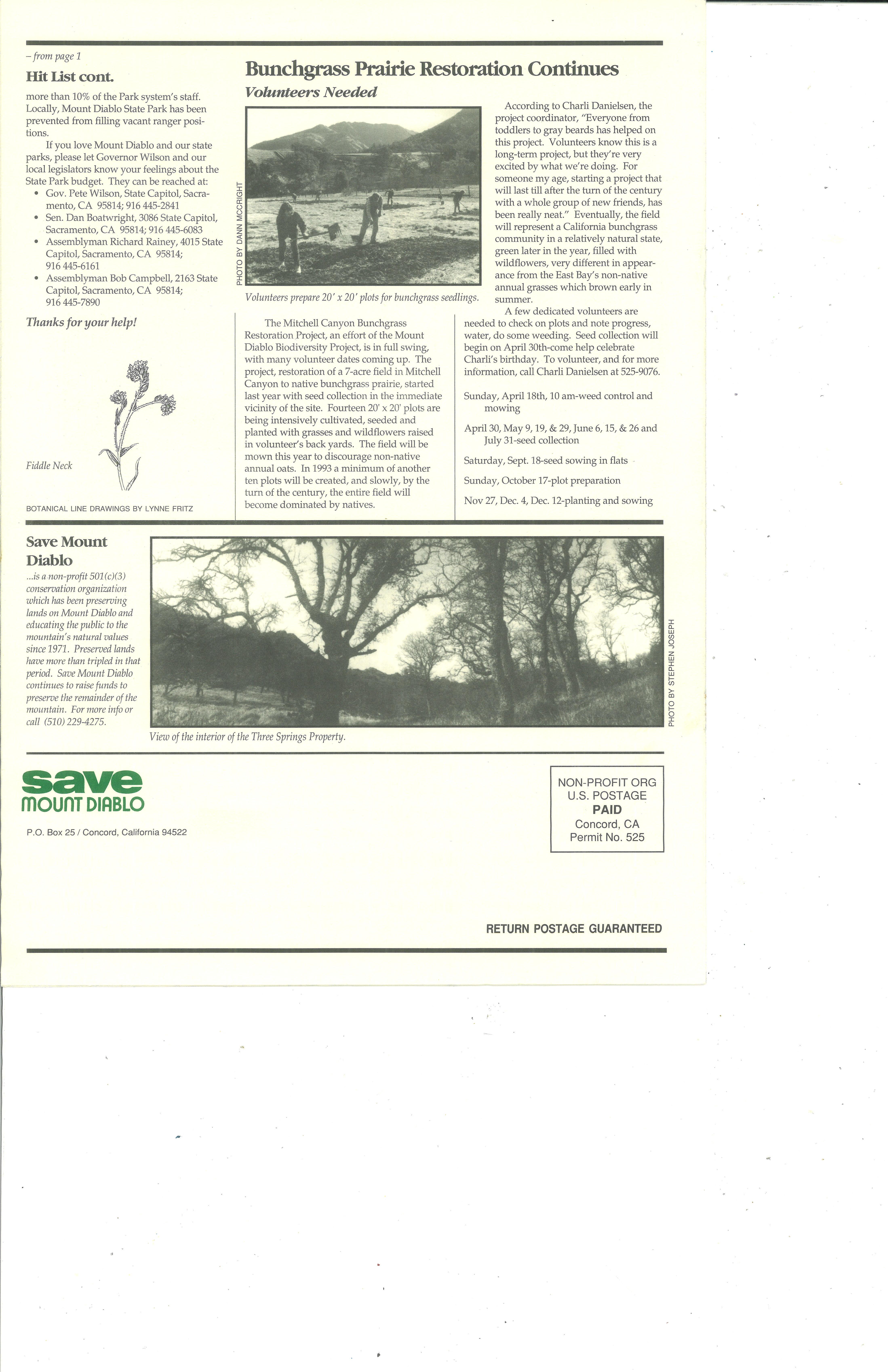 SMD members have responded generously this last year to appeals for donations to secure Three Springs, which is on the slopes of North Peak. Negotiations were concluded on Earth Day, Apri122,1992, and using a loan arid diversion of other funds, the property was acquired by SMD on May 12. On December 24th, the group received a great Christmas gift when the final paperwork with the stdte was concluded, and the title passed to the State of California. Donations to the purchase will now be rerycled into SMD's Land Fund for the group's next land'acquisition.