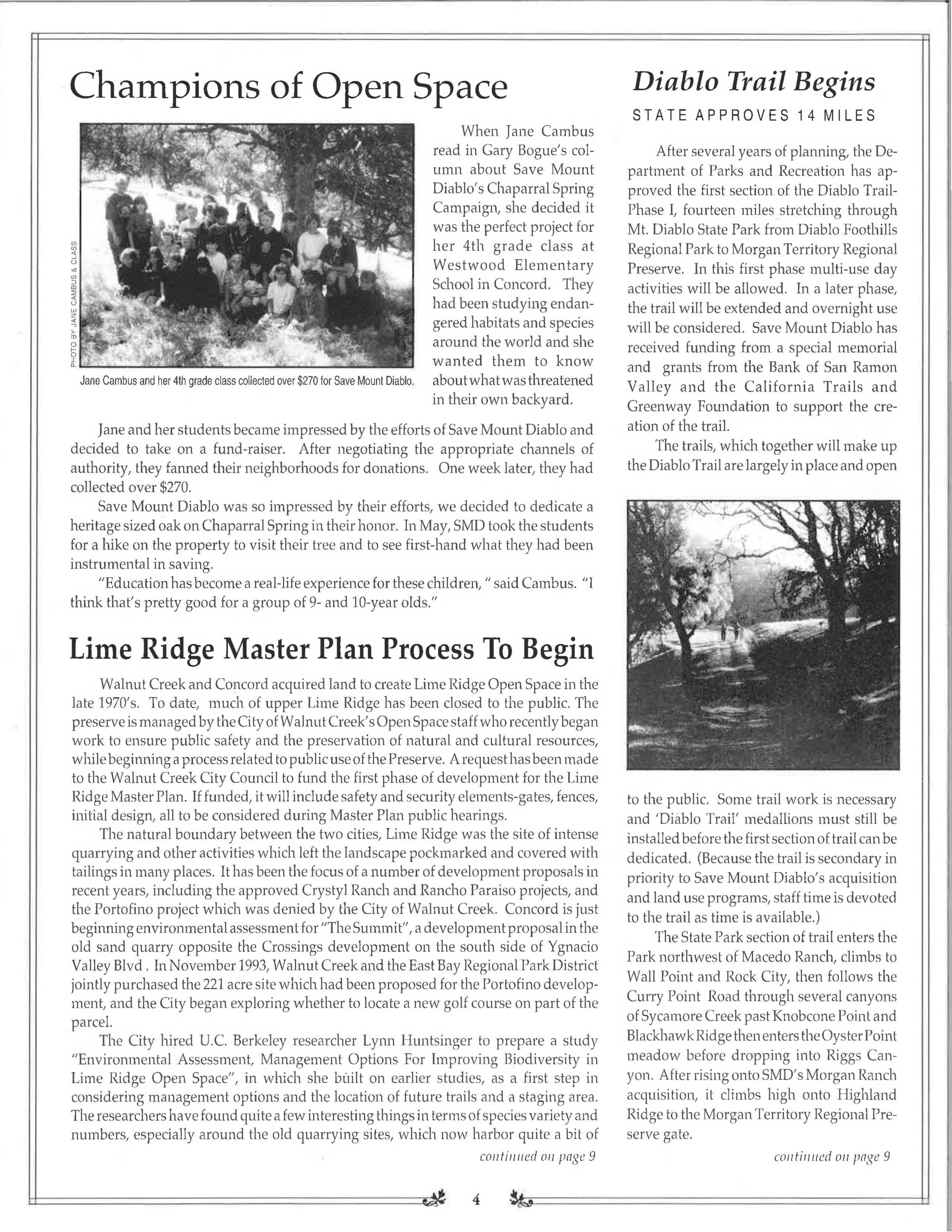 Gary Bogue has been our unofficial "friendraiser" before. In 1988, Bogue and SMD embarked on a similar endeavor and raised $40,000 to help buy the 631-acre Morgan Property on the east side of Mount Diab lo. This time, Bogue decided to incorporate the new Heritage Trees Program into his fundraiser. He challenged his readers to raise enough funds for Chaparral Spring to sponsor the largest tree ($1,000), five beautiful acres of open space ($10,000) and a 10acre grove ($25,000). Contributors were encouraged to come up with a group name to be placed on a permanent plaque.