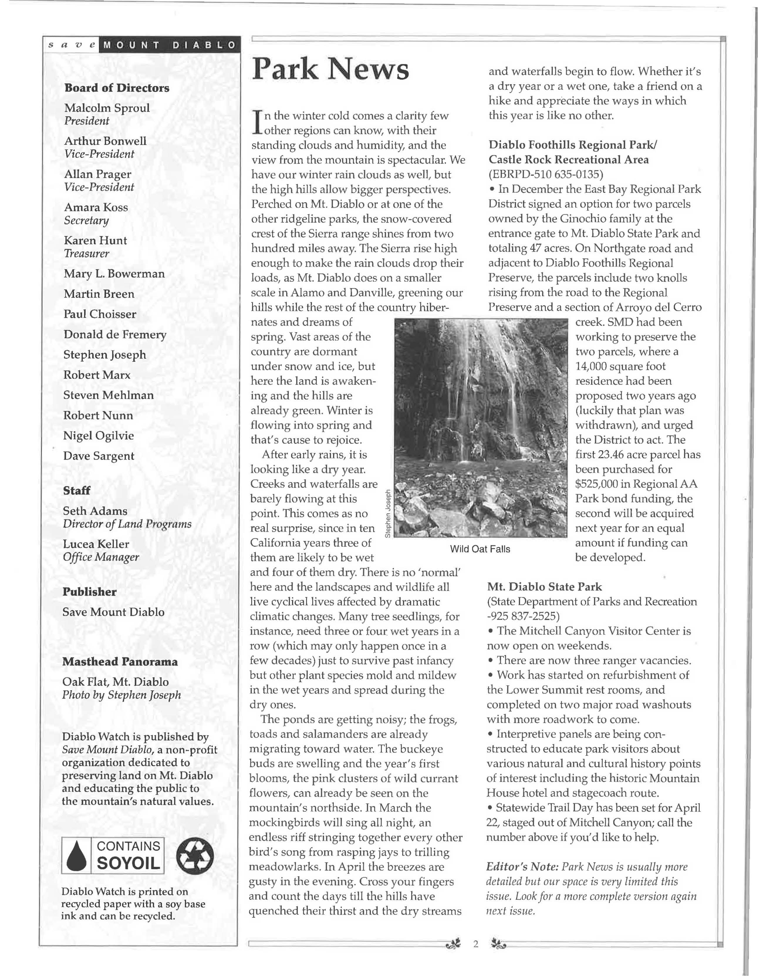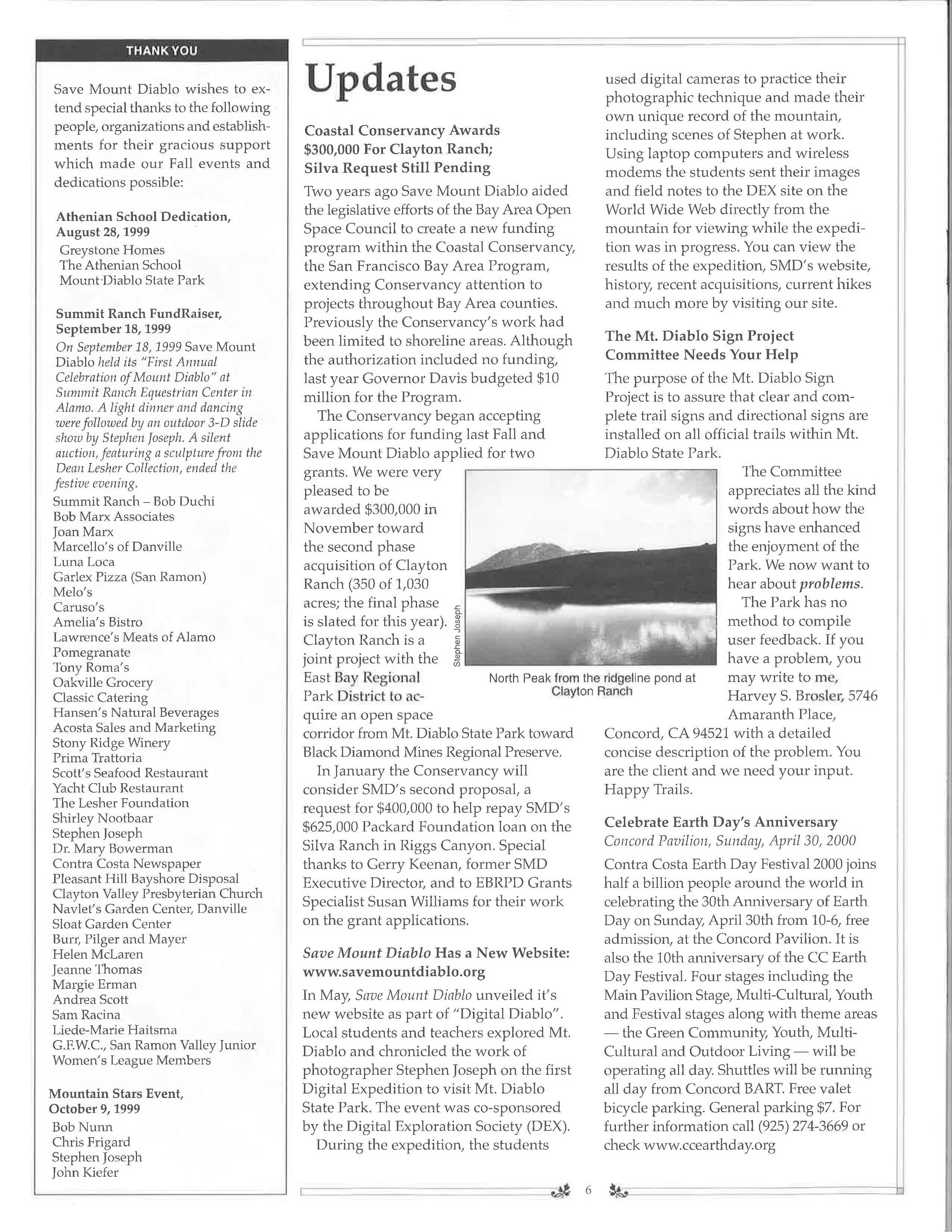 Although SMD had no involvement in these final two efforts near Livermore, they nonetheless extend public ownership in the Diablo area from Walnut Creek all the way to the Livermore valley, a goal of Sav e Mount Diab/a. In January the Park