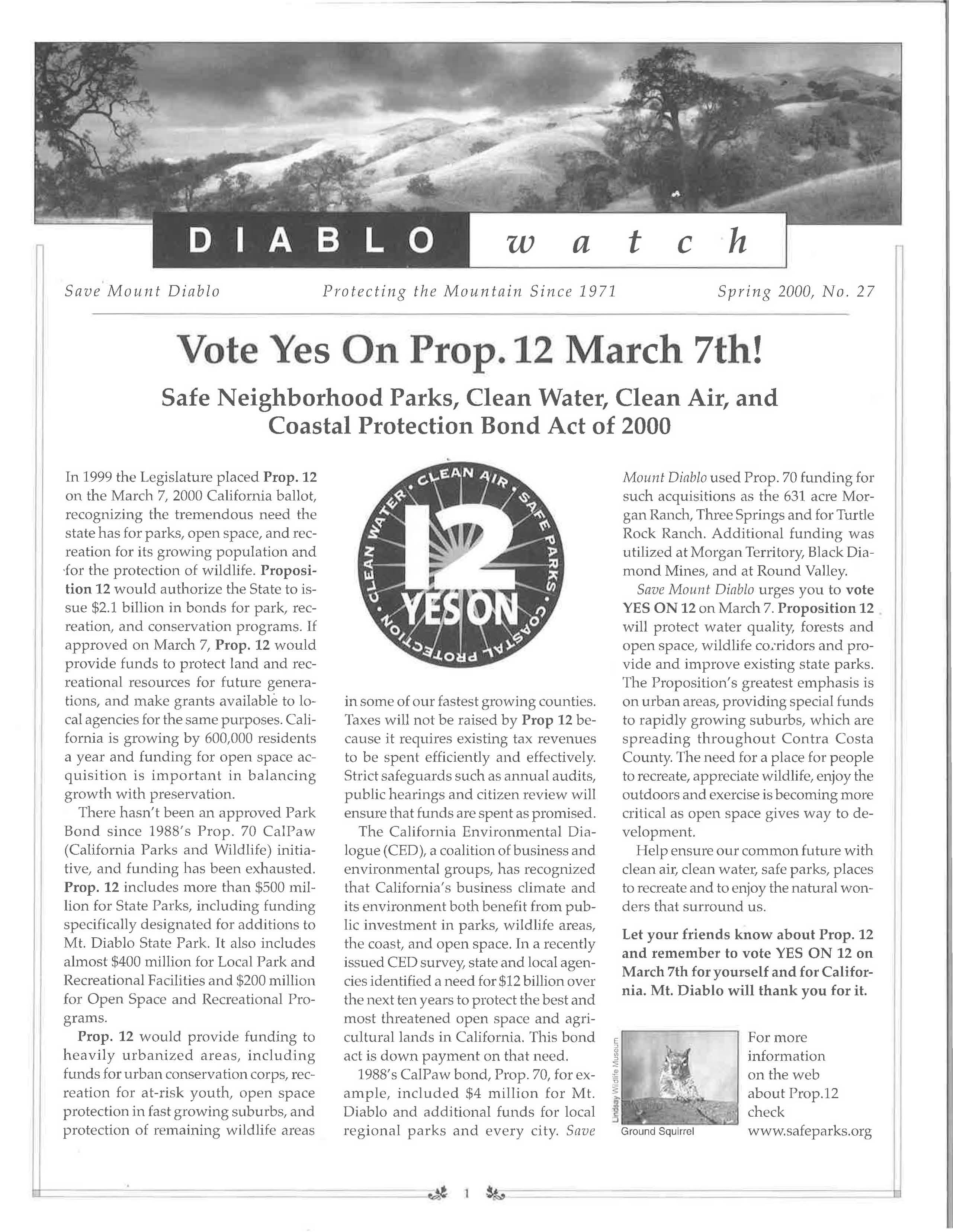 Save Mount Diablo urges you to vote YES ON 12 on March 7. Proposition 12 will protect water quality, forests and open space, wildlife co:ridors and provide and improve existing state parks. The Proposition's greatest emphasis is on urban areas, providing special funds to rapidly growing suburbs, which are spreading throughout Contra Costa County. The need for a place for people to recreate, appreciate wildlife, enjoy the outdoors and exercise is becoming more critical as open space gives way to development.