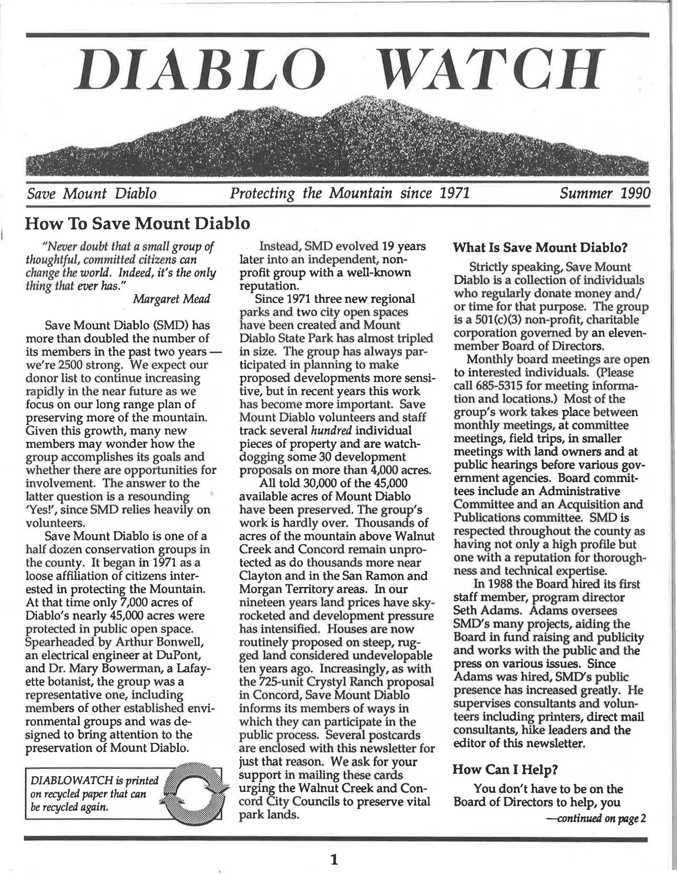 All told 30,000 of the 45,000 available acres of Mount Diablo have been preserved. The group's work is hardly over. Thousands of acres of the mountain above Walnut Creek and Concord remain unprotected as do thousands more near Clayton and in the San Ramon and Morgan Territory areas. In our nineteen years land prices have skyrocketed and development pressure has intensified. Houses are now routinely proposed on steep, rugged land considered undevelopable ten years ago. Increasingly, as with !he 725-unit Crystyl Ranch proposal m Concord, Save Mount Diablo informs its members of ways in which they can participate in the public process. Several postcards are enclosed with this newsletter for just that reason. We ask for your support in mailing these cards urging the Walnut Creek and Concord City Councils to preserve vital park lands.