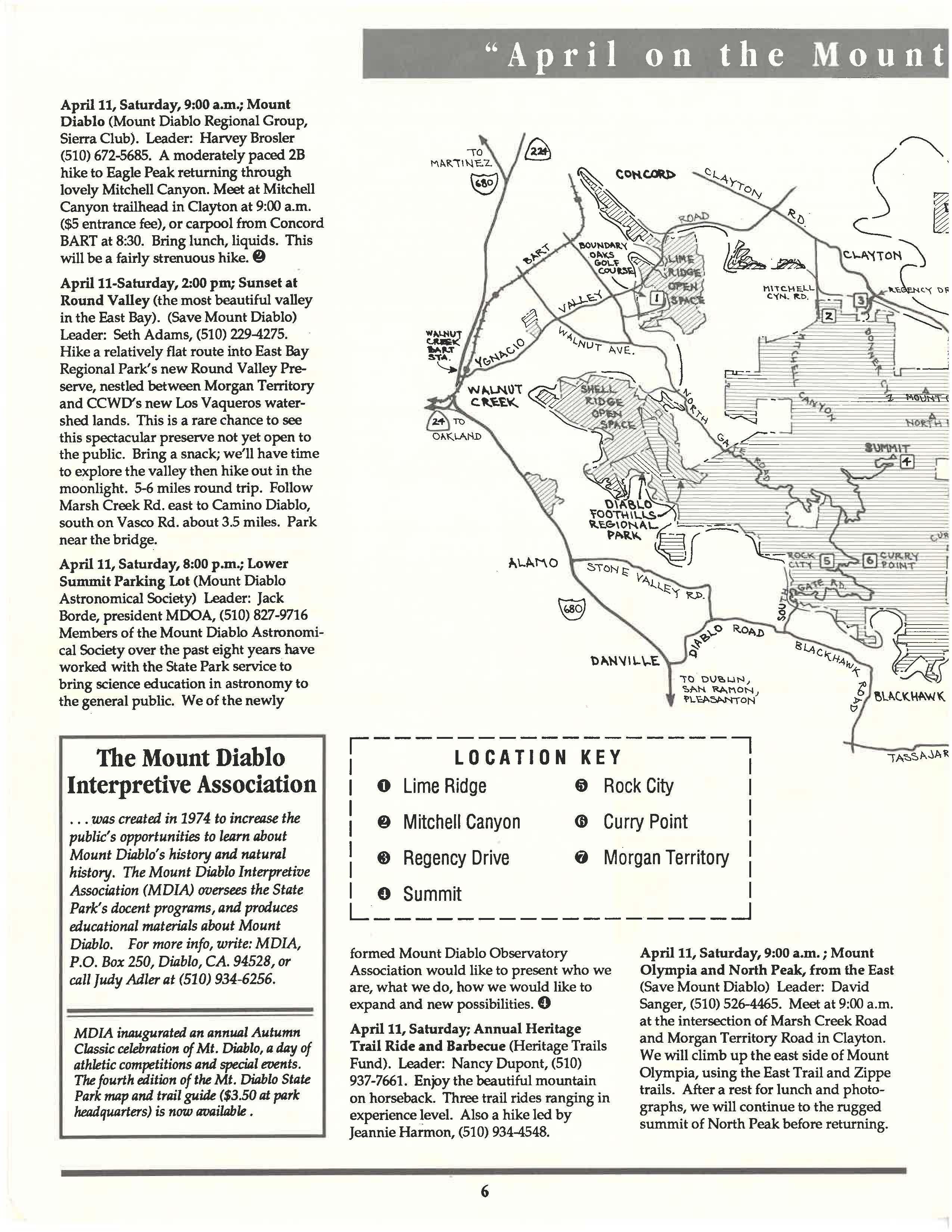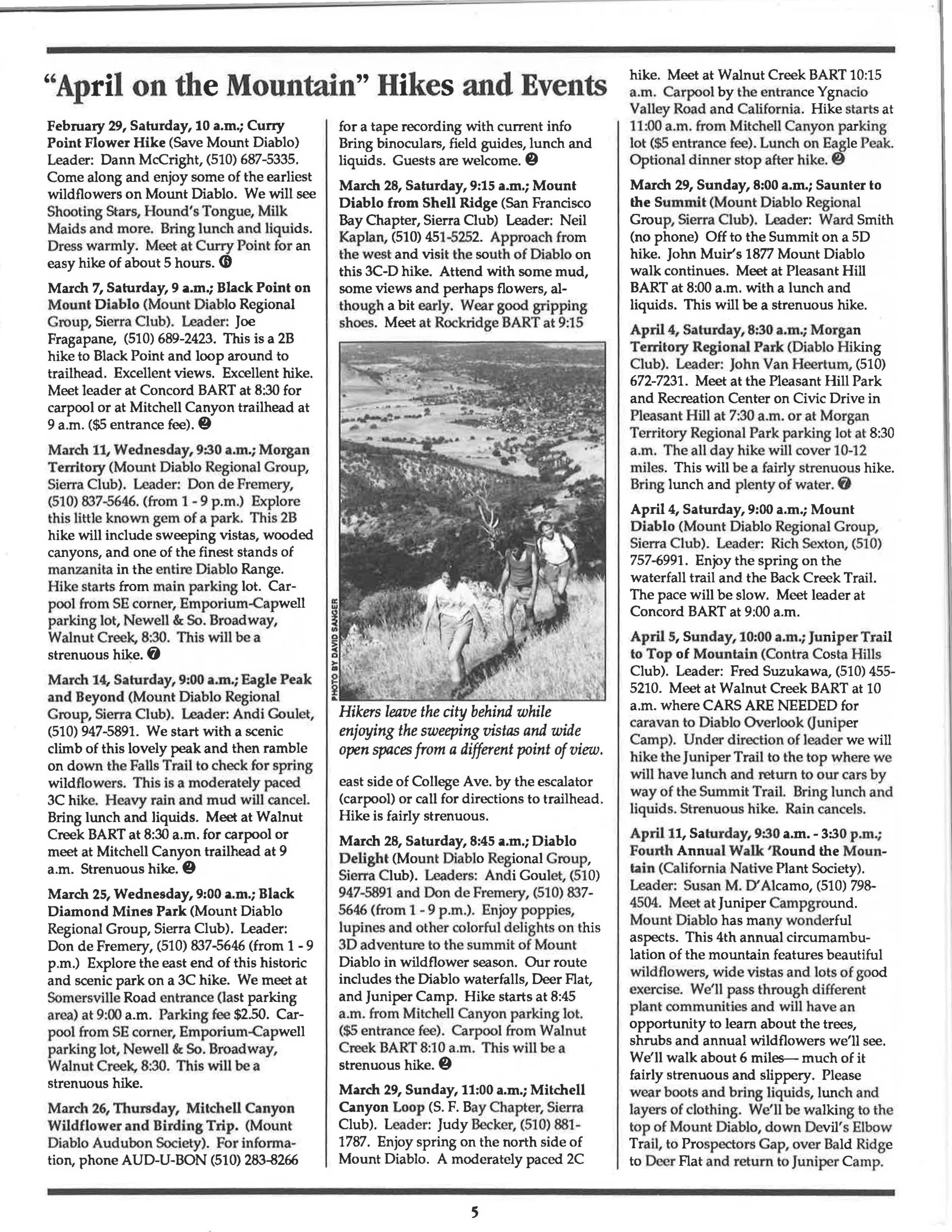 March 28, Saturday, 9:15 a.m.; Mount Diablo from Shell Ridge (San Francisco Bay Chapter, Sierra Oub) Leader: Neil Kaplan, (510) 451-5252. Approach from the west and visit the south of Diablo on this 3C-D hike. Attend with some mud, some views and perhaps flowers, although a bit early. Wear good gripping shoes. Meet at Rockridge BART at 9:15