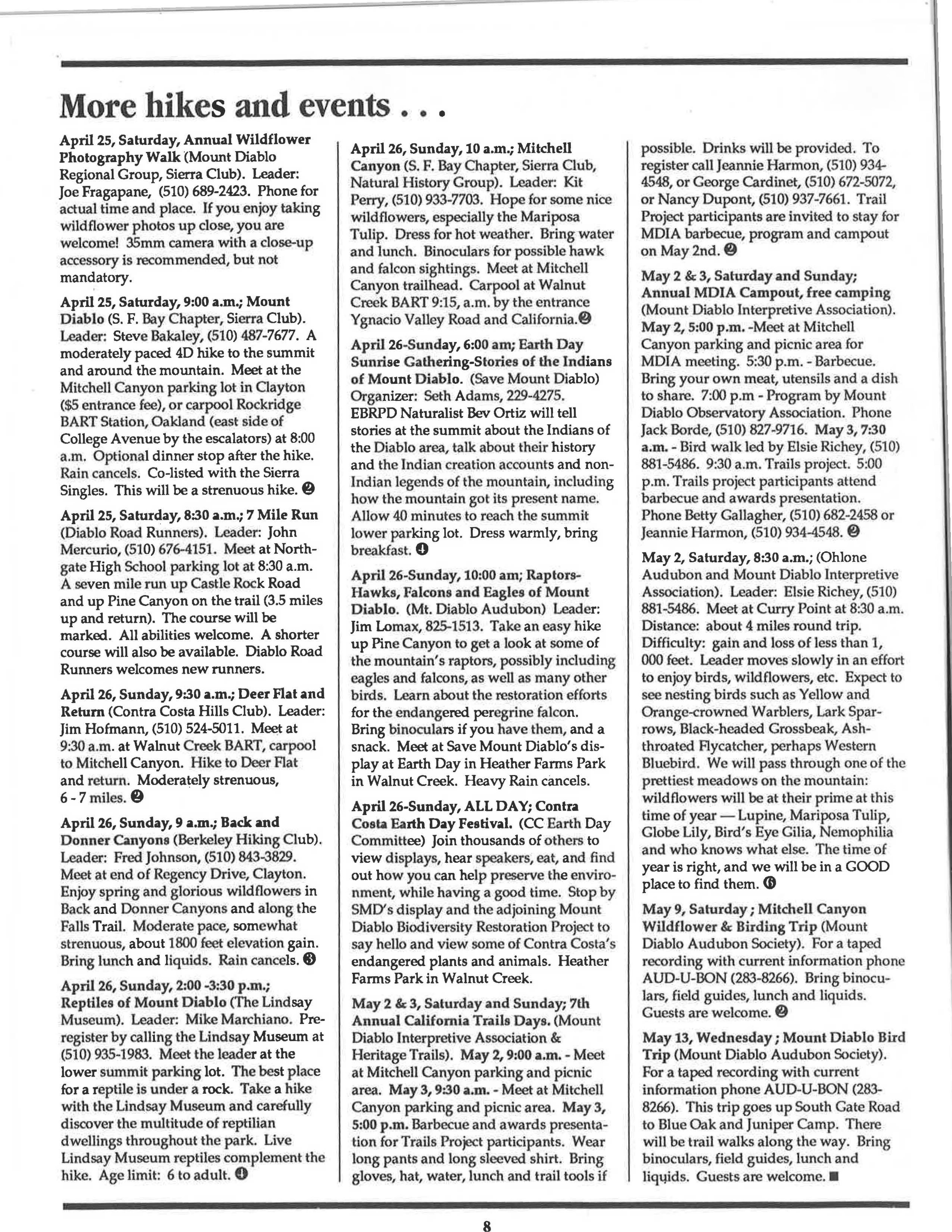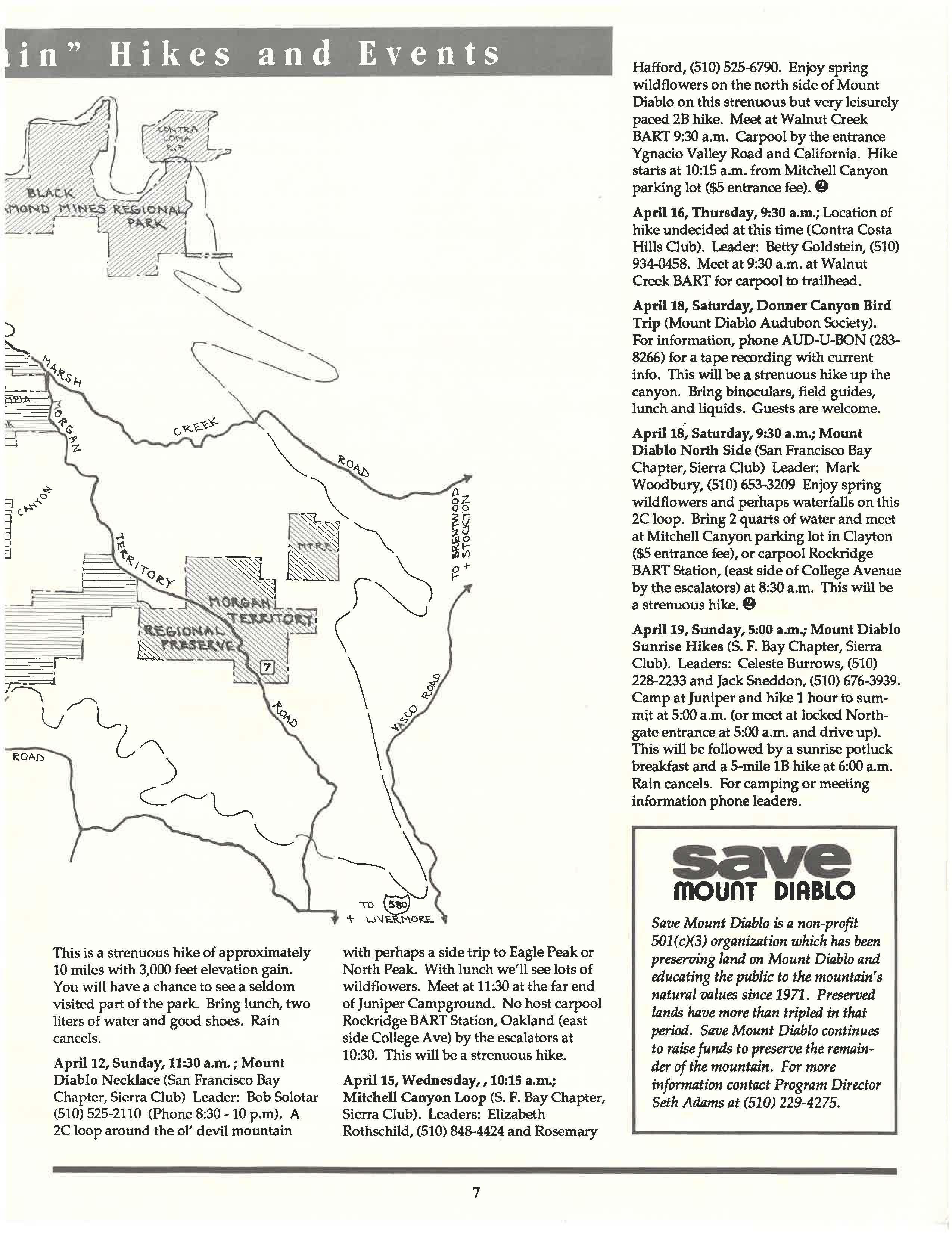 March 25, Wednesday, 9:00 a.m.; Black Diamond Mines Park (Mount Diablo Regional Group, Sierra Club). Leader: Don de Fremery, (510) 837-5646 (from 1 - 9 p.m.) Explore the east end of this historic and scenic park on a 3C hike. We meet at Somersville Road entrance (last parking area) at 9:00 a.m. Parking fee $2.50. Carpool from SE corner, Emporium-Capwell parking lot, Newell & So. Broadway, Walnut Creek, 8:30. This will be a strenuous hike.