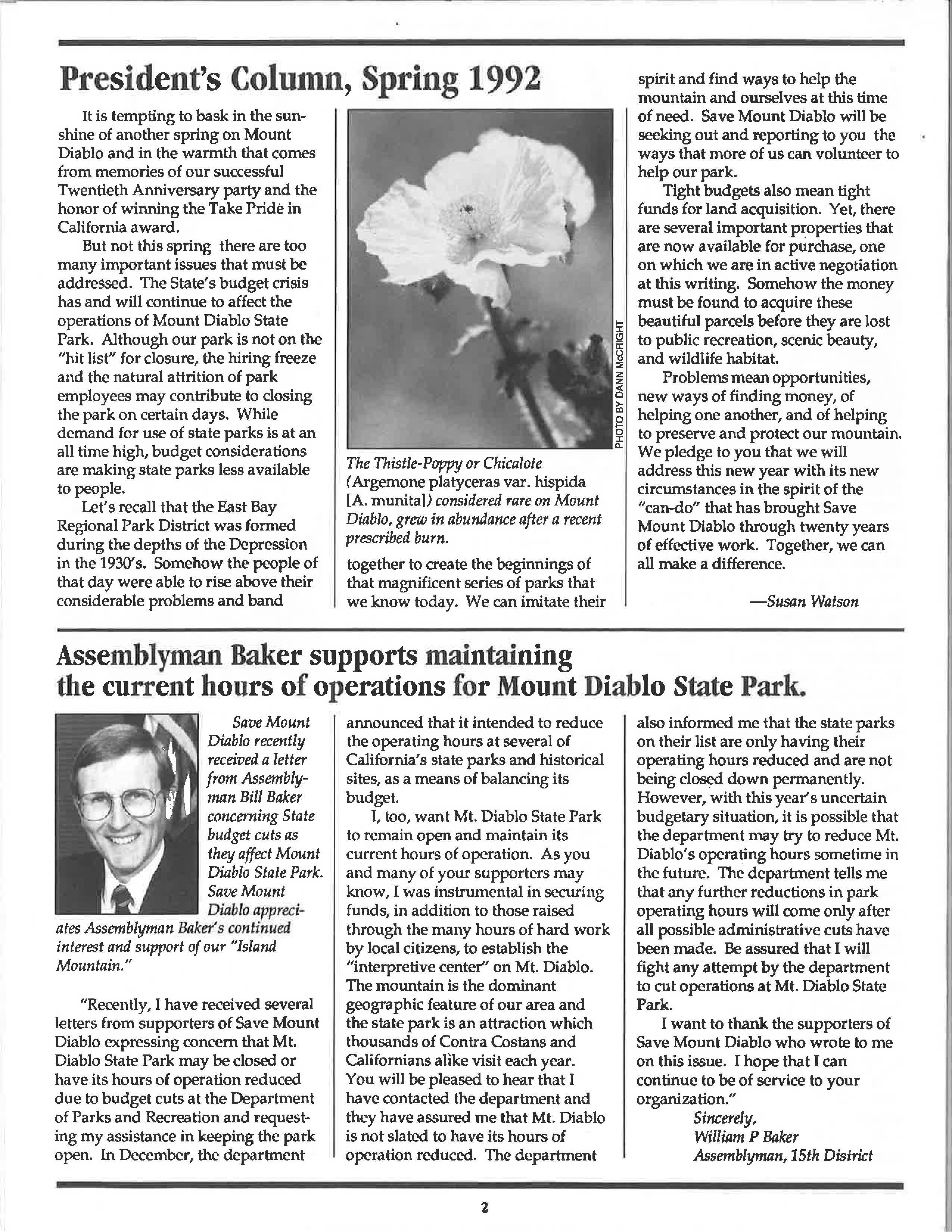 Save Mount Diablo recently received a letter from Assemblyman Bill Baker concerning State budget cuts as they affect Mount Diablo State Park.