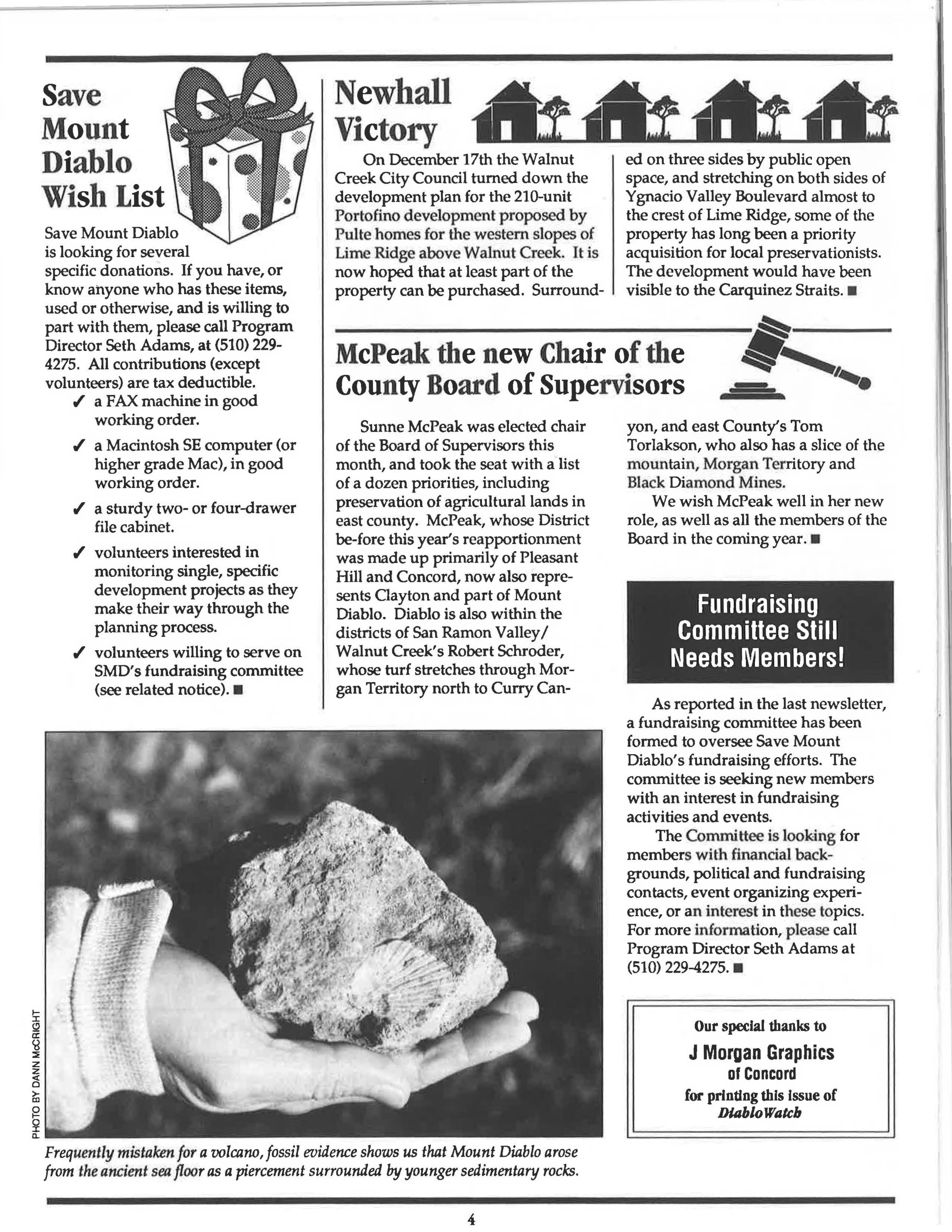 As reported in the last newsletter, a fundraising committee has been formed to oversee Save Mount Diablo' s fundraising efforts. The committee is seeking new members with an interest in fundraising activities and events.